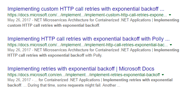 | In order to create resilient microservices, you need to handle possible HTTP failure scenarios. For that purpose, you could create your own implementation of retries with exponential backoff. | ||