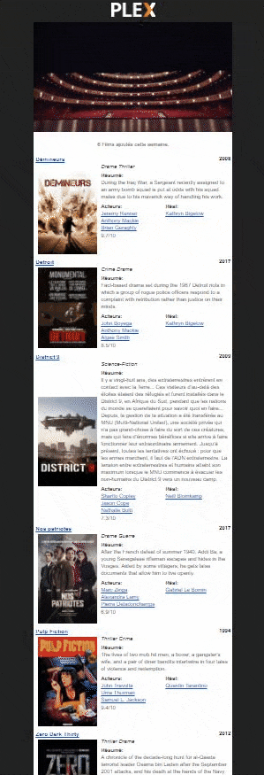 plexRecapWeekly connects to your Plex Media Server to grab all movies added in the last 7 days, generate an HTML template with jinja2, and send it to the recipients that you have configured in config.ini.