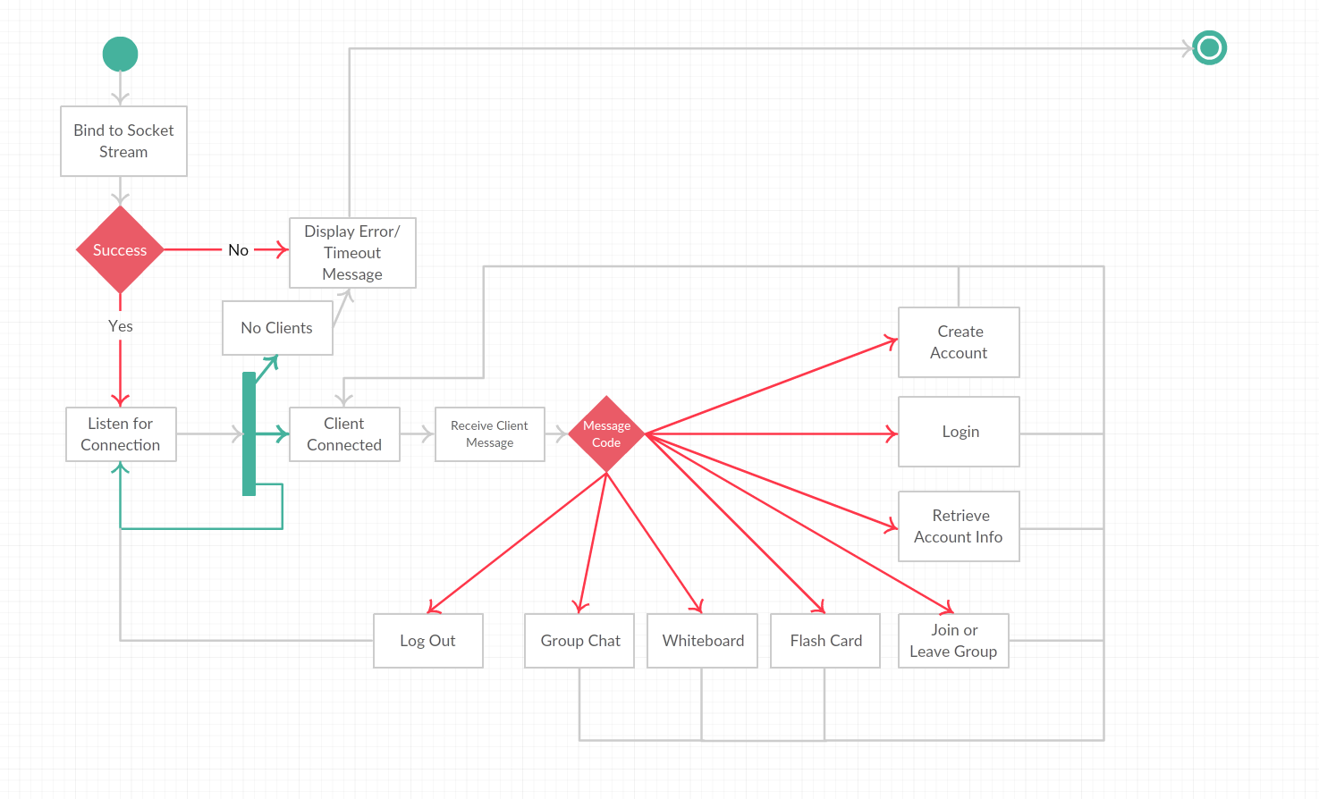 Every user first makes an account and connects their StudyGroup client to the server, which is able to host multiple groups at once. These groups are able to study together and use the built-in study tools, such as whiteboard mode and flashcard mode. The server and database must be able to facilitate account creation/login and transmit chat to users within the appropriate group. The client must be able to establish a reliable connection with the server and communicate relevant information when needed.