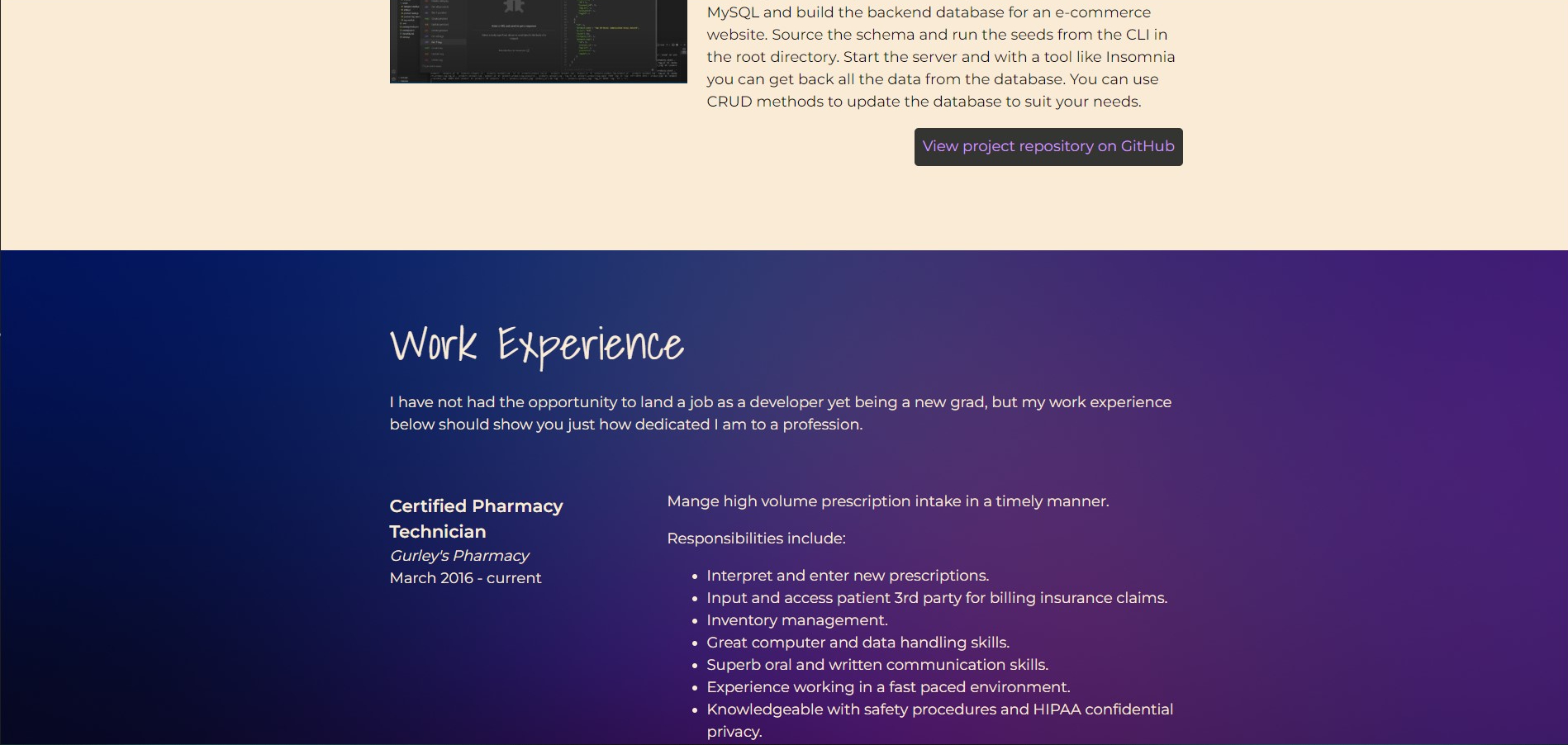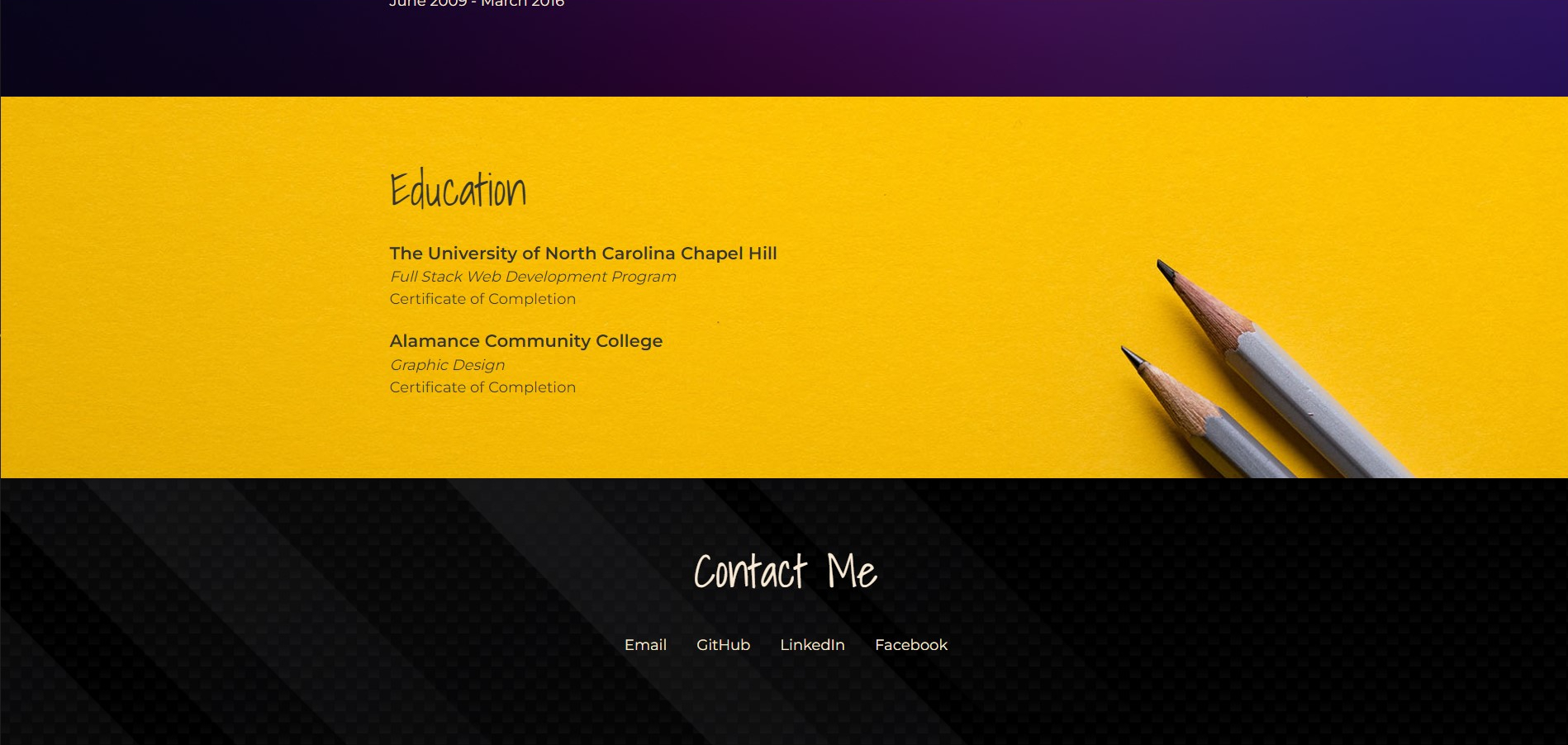 Responsive portfolio and resume built with just HTML and CSS. No packages or frameworks, just a few Google fonts and some stock images from shutterstock. I will be continually updating, eventually converting to a React page.