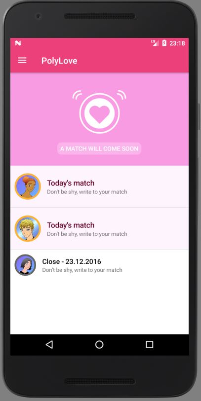 PolyLove is a "dating" app to help EPFL and UNIL students meet! Our spirit is quality over quantity: once a day, the app matches two students and opens an anonymous chat to allow them discussing. Over the day, additional secrets about both love seekers will be slowly revealed. At the end of the day, if they like each other, their identities will be revealed, unless they prefer to try again with someone else the next day... Will you build a relationship that stands the test of time ?