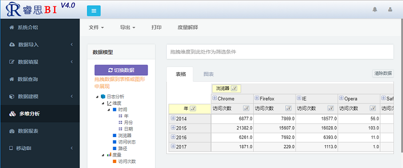 “睿思BI”商业智能系统是由北京睿思科技有限公司自主研发的企业数据分析系统。 系统包含数据建模、数据报表、多维分析、仪表盘、移动BI等功能模块,方便企业快速建立一套易用,灵活、低成本的商业智能平台,实现数据的快速分析及可视化。