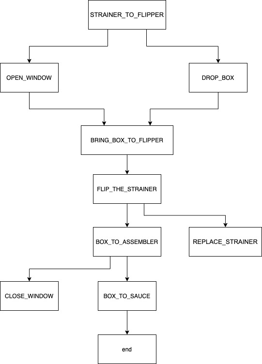 The goal of this case study is to reproduce the sequence (the picture below) sending CAN message needed to prepare a dish depending on requeriements. A task receiving an arrow on the sequence needs to wait for the end of the previous task to be started let's call it a requirement. A task can have more than 1 requirement like the BRING_BOX_TO_FLIPPER, so you will have to wait for all the requirements acknowledgement to start this task. In your case you are in charge of a part of meal creation, that's why the sequence is short. You will receive STRAINER_TO_FLIPPER acknowledgement message every ARBITRARY_DURATION's value (stored in commander file) from the system Arm and you will have to manage all the tasks until BOX_TO_SAUCE. Print the can message you send and the acknowlegement you receive in the format
