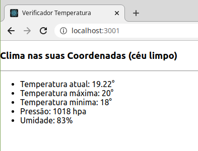 Application that uses API to show the climatic condition of the place Application that shows the current temperature, the minimum, maximum temperature, pressure and humidity in the user's coordinates. Below we see a photo of its operation.