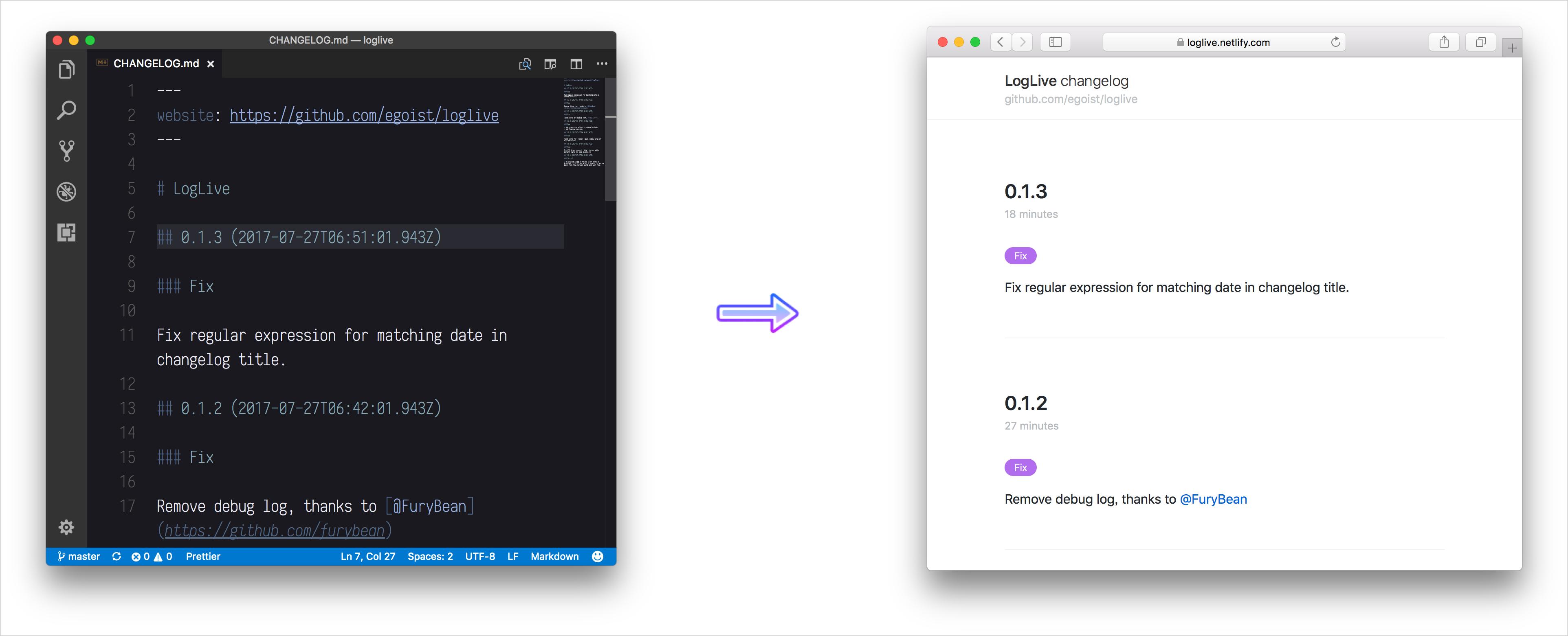 </html>Then you can start to write a CHANGELOG.md, by default LogLive will read from http://your-website/CHANGELOG.md, however you can use a custom path: