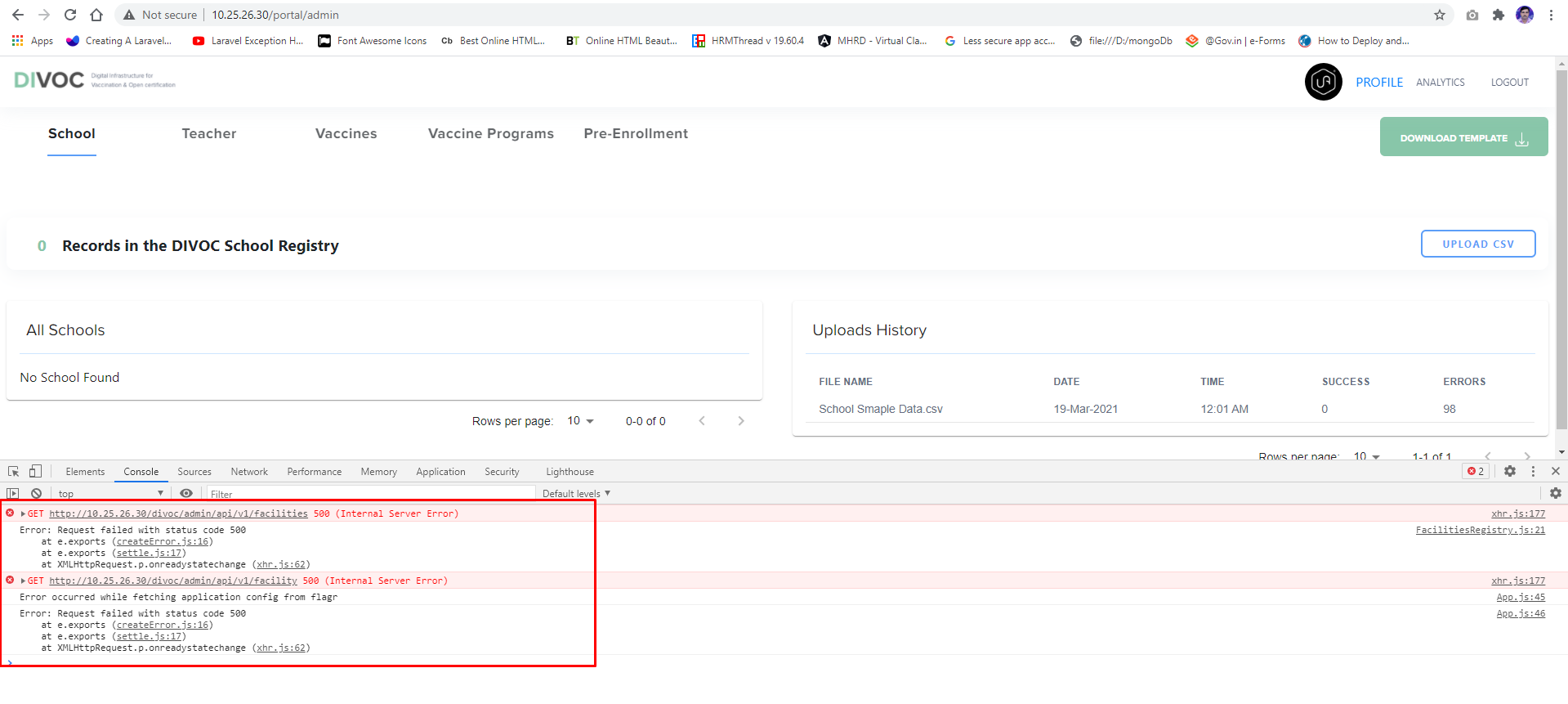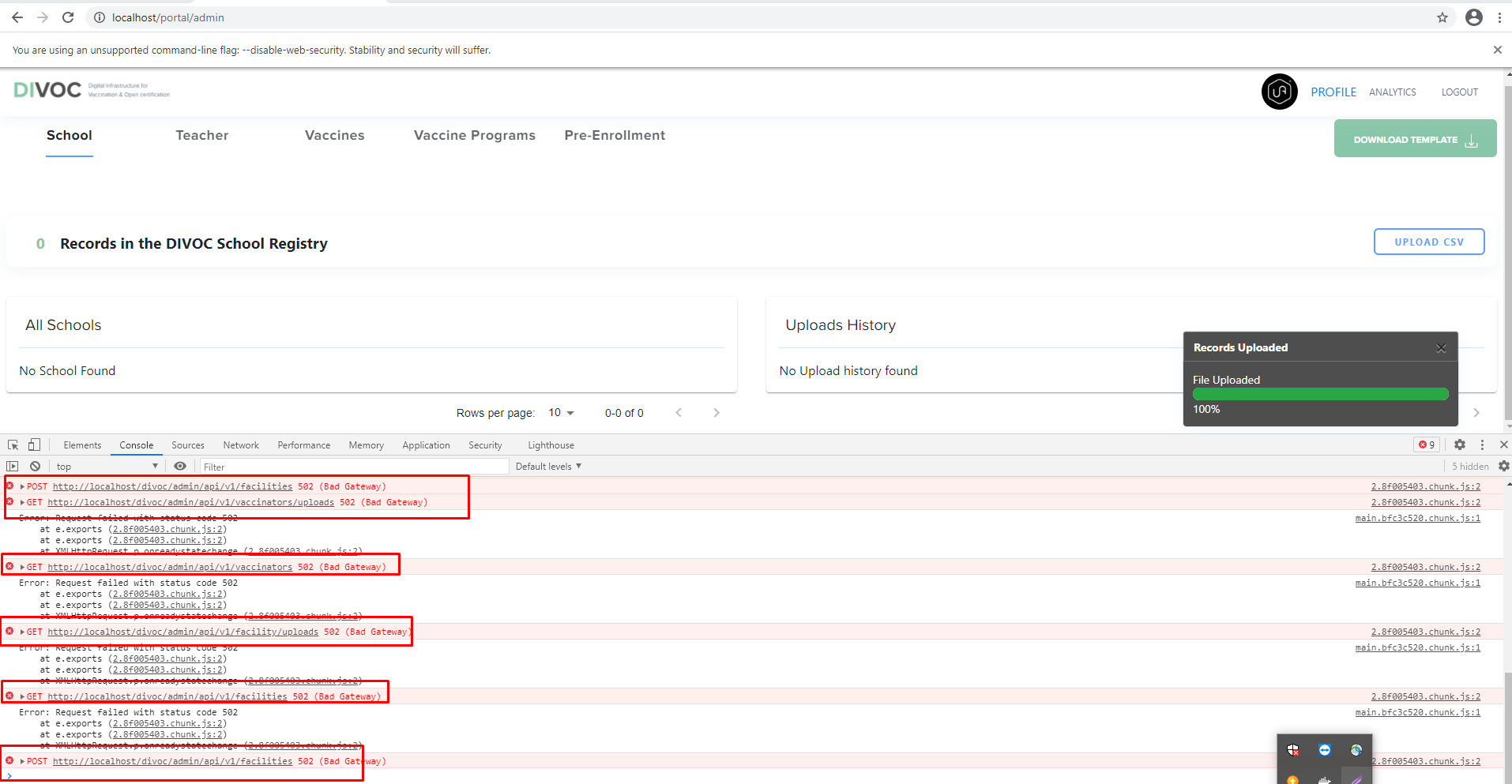 I have configure system on local machine. but I am trying to uploading data on system. so I am facing 502 bad gateway error please check my below screenshot. Please suggest me how to fix. |