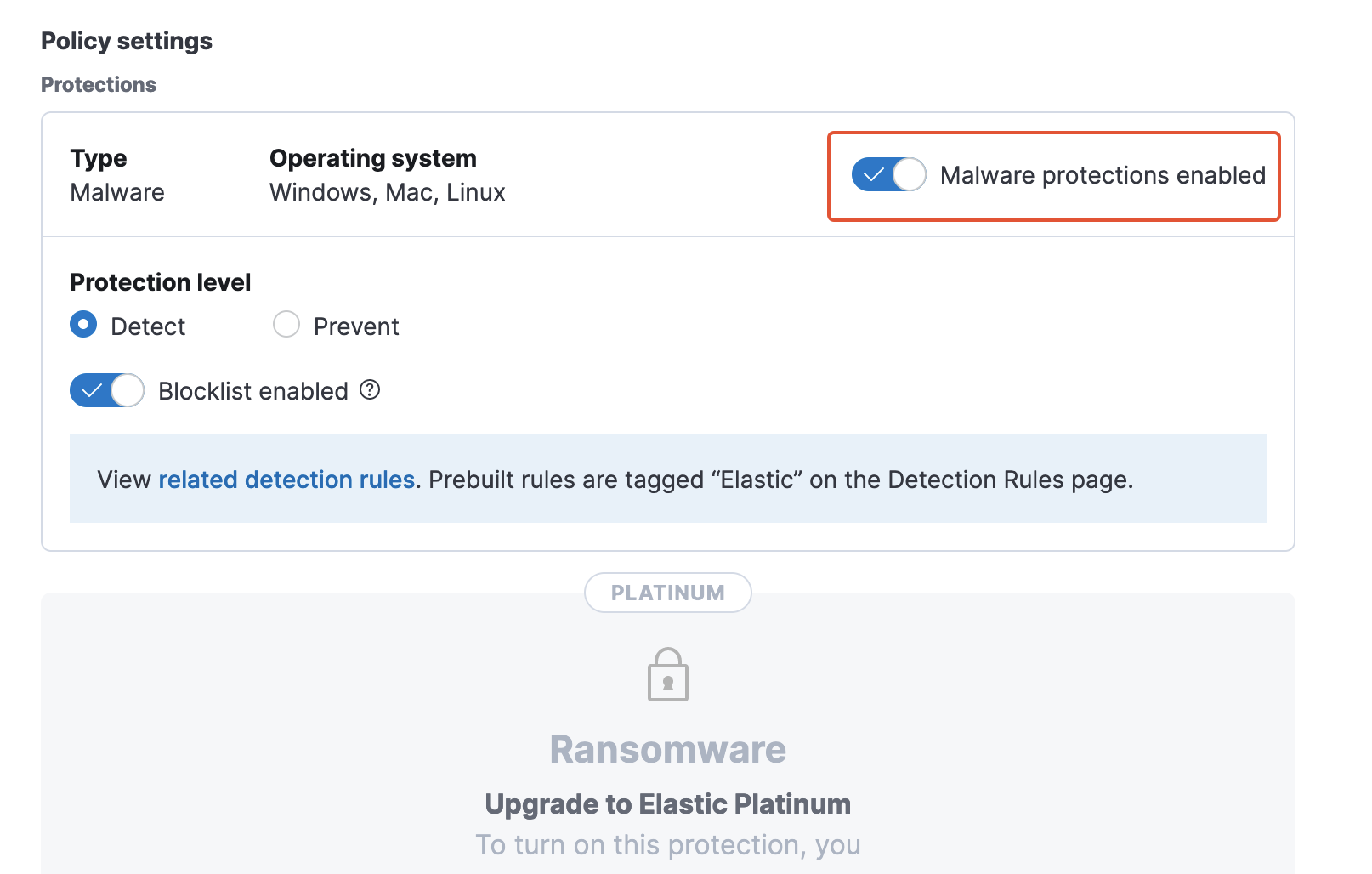 - Set "Malware protection" to "enabled" and "Detect" options + save.