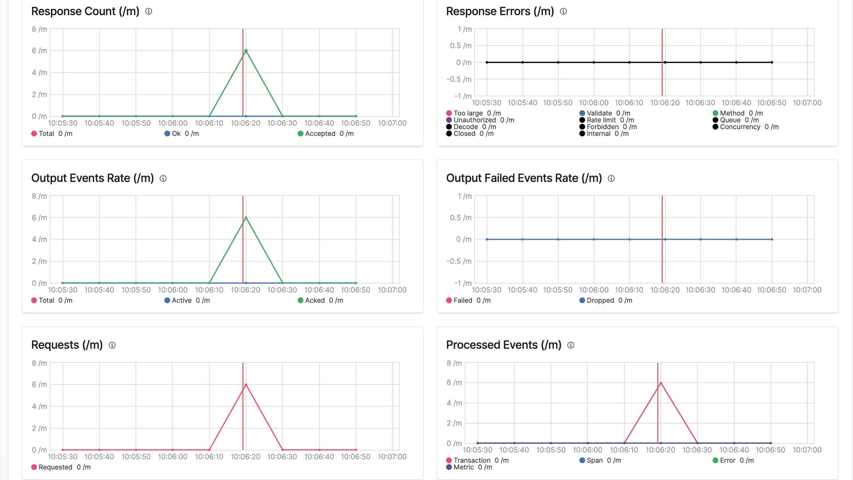 The visualized data for APM monitoring seem to diverge from the amount of data ingested. Breaking this down to only having 1 ingestion request containing 1 event, the visualization shows 6 requests/m and 6 events/m (see screenshot):