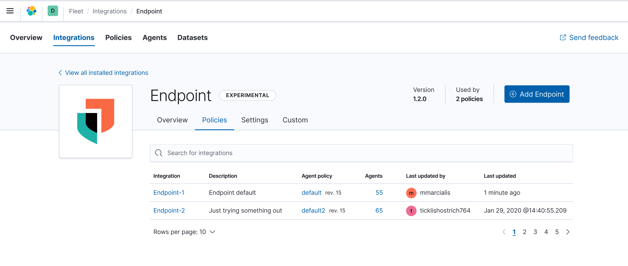 - Integration name, links to existing Integration Policy Edit