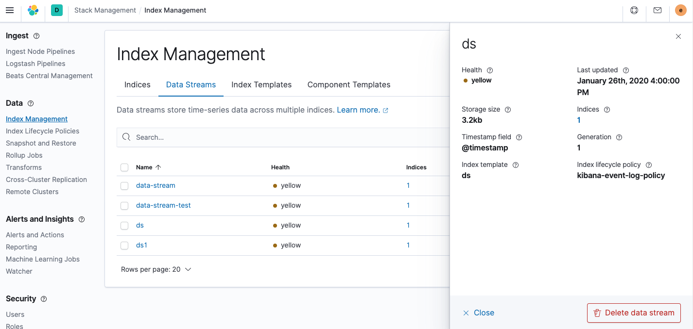 The Data Streams tab in Index Management now allows users to view additional information for data streams: