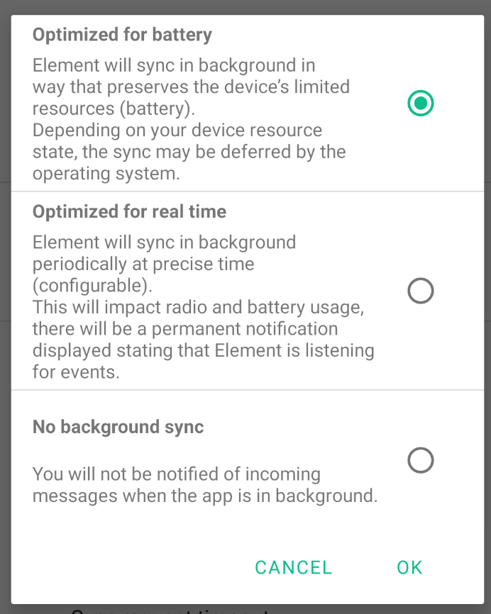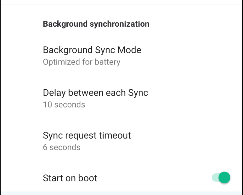 Optimized for Real Time : This mode requires the app to be exempted from battery optimization. Alarms will be launched and will wake up the app in order to perform the background sync as a foreground service. After completion the service will schedule another alarm