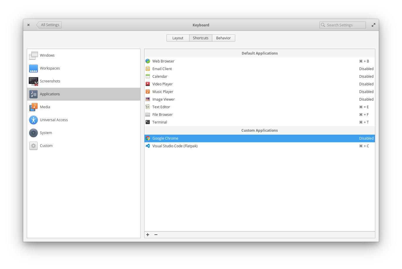 @jlnr I have now added a possibility to bind custom applications and I also did a first implementation (elementary/settings-keyboard#233) for the settings-keyboard plug. It would be nice to get some feedback! When switching back to master don't forget to remove the plugin: |