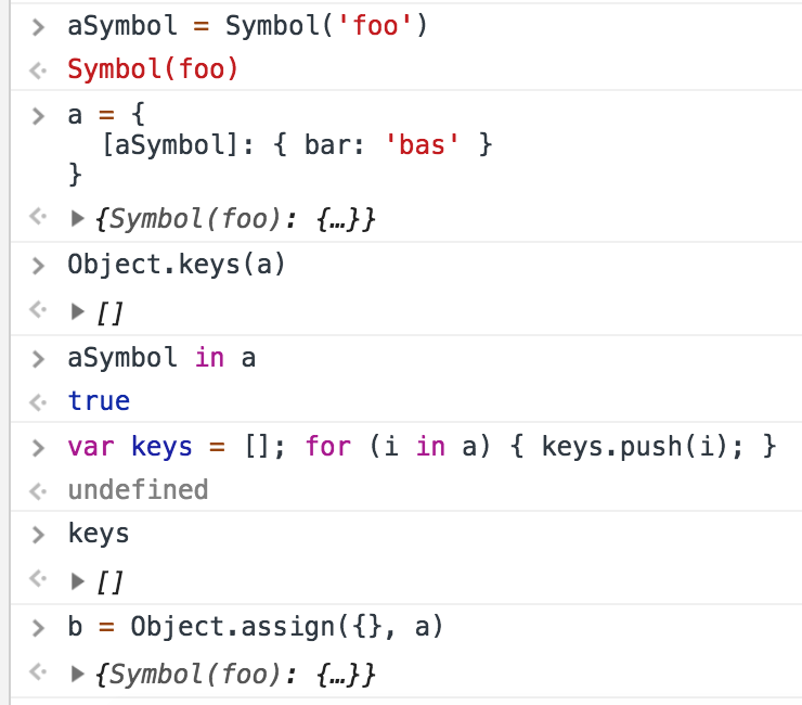 RE assign, since we are using a Symbol, Object.assign and the Ember polyfill "just work". Object.keys and for ... in do not work unless using Ember's Symbol polyfill.
