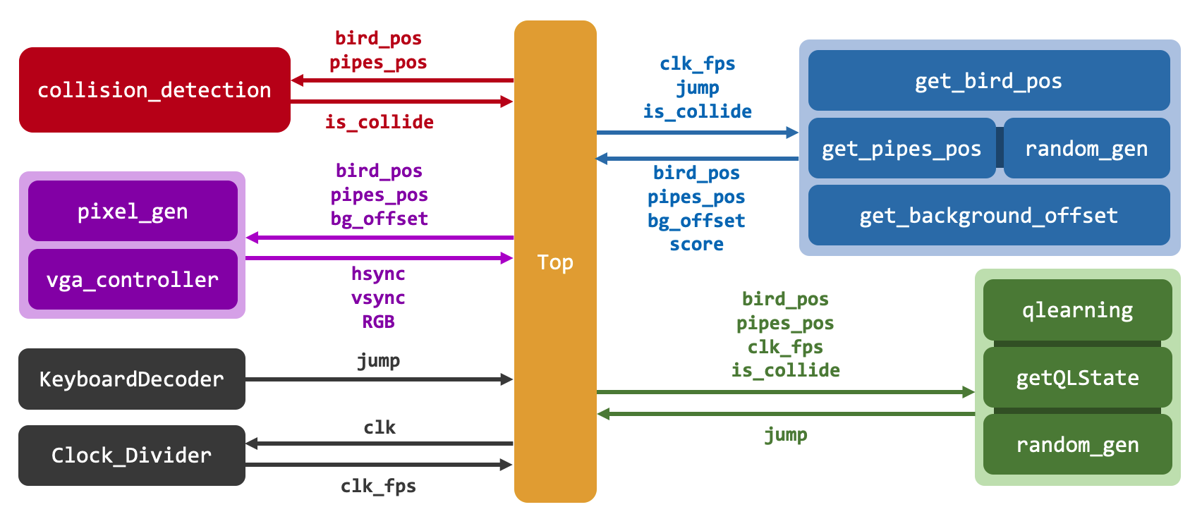 Flappy Bird is a 2D mobile game. A bird named “Faby” continuously move to the left. The bird briefly flaps (jump) upward each time we pressed the space key. A set of pipes keep moving right. The bird died once it touch the pipes, ground or sky. We implement the game on the FPGA board. Using keyboard as input and VGA as output. Also, we use Q-Learning method to train the bird flaps by it self on the same FPGA board. Once it’s fully trained, it should be able to set the high score.