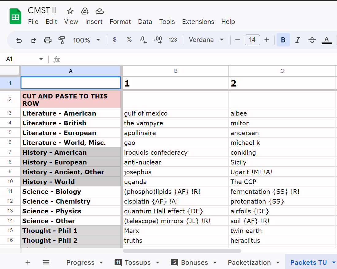 A completed quizbowl tournament, consisting of a set of category Google Docs containing all the questions in a category. A spreadsheet containing two tabs that have the packetized tossup and bonus answerlines. See "Answerline formatting guidelines" for details. Spreadsheet tabs should look something like this (spoilers for the first two rounds of CMST II):In particular, the first column MUST contain all of the categories, formatted as "Category - Subcategory". The category MUST match the corresponding string in the dictionary of document URLs in the script (lines 2-7, see below).