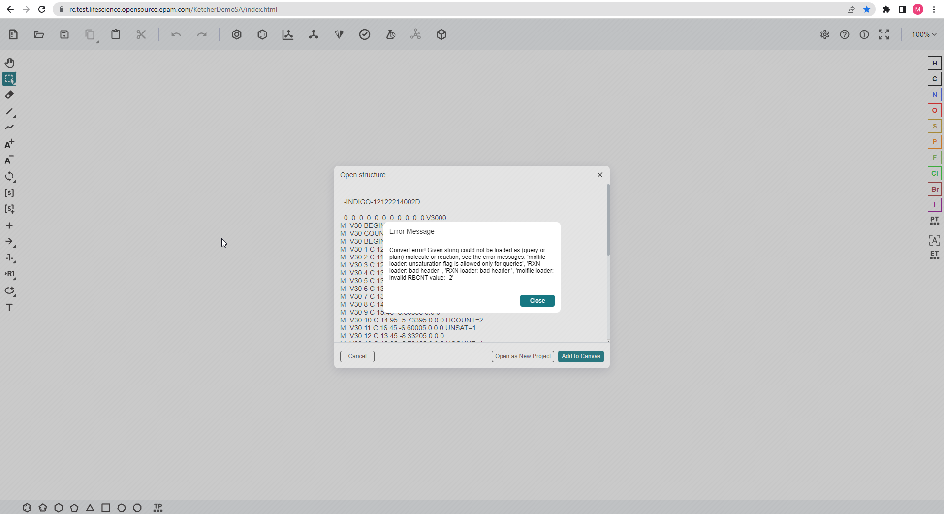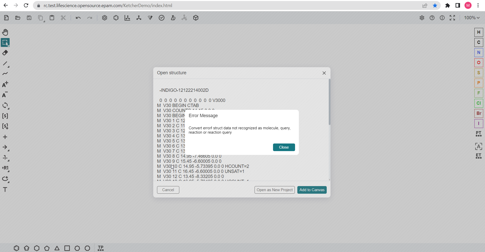 Remote Error message: Convert error! struct data not recognized as molecule, query, reaction or reaction query