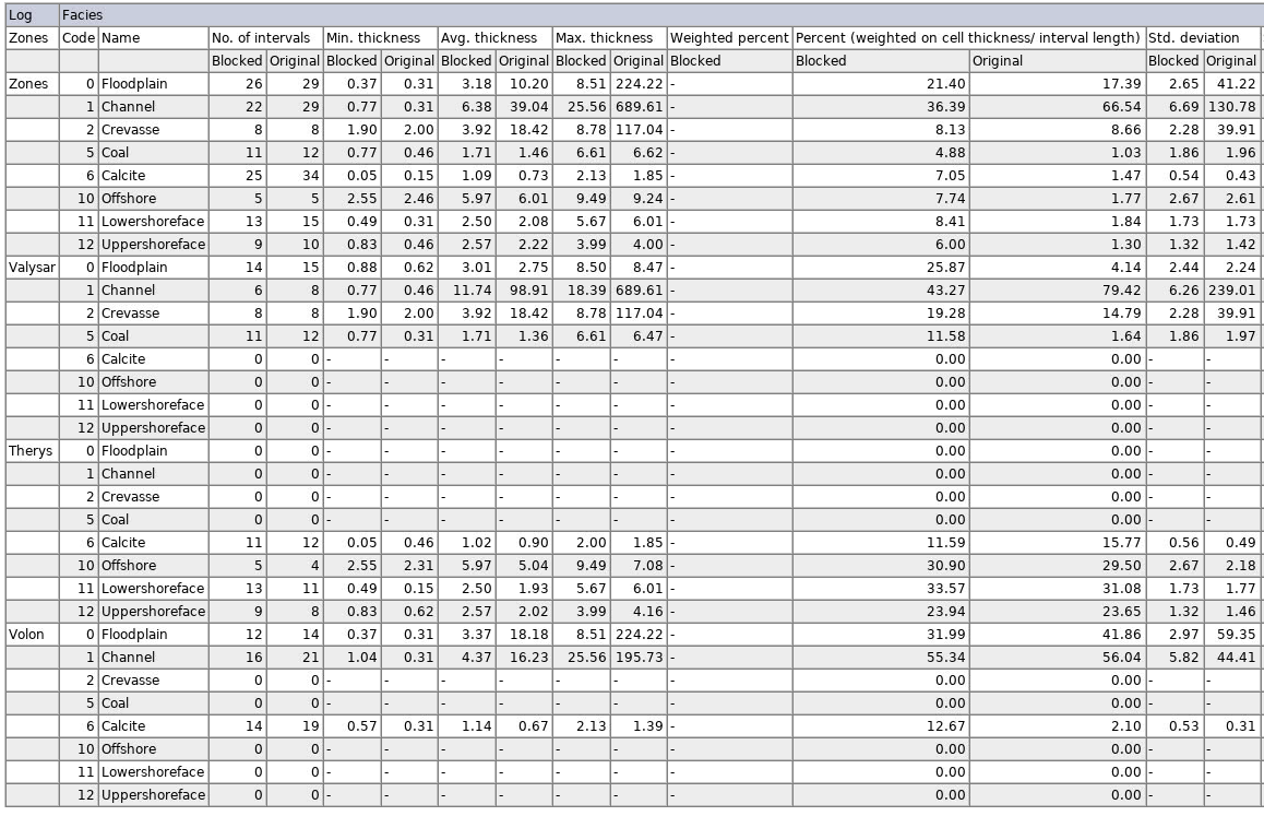 - Should have a tab for facies thickness statistics (min/max/avg/) and facies fraction percentage per zone and facies.
