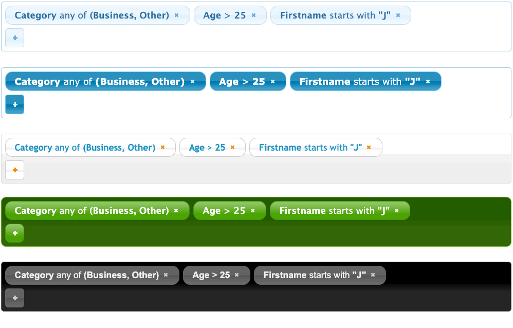 structured-filter is as easily themeable as any jQuery UI widget, using one of the jQuery UI themes or your own custom theme made with Themeroller.
