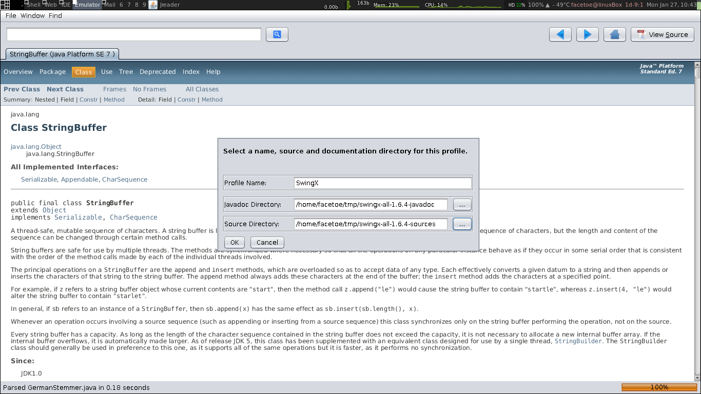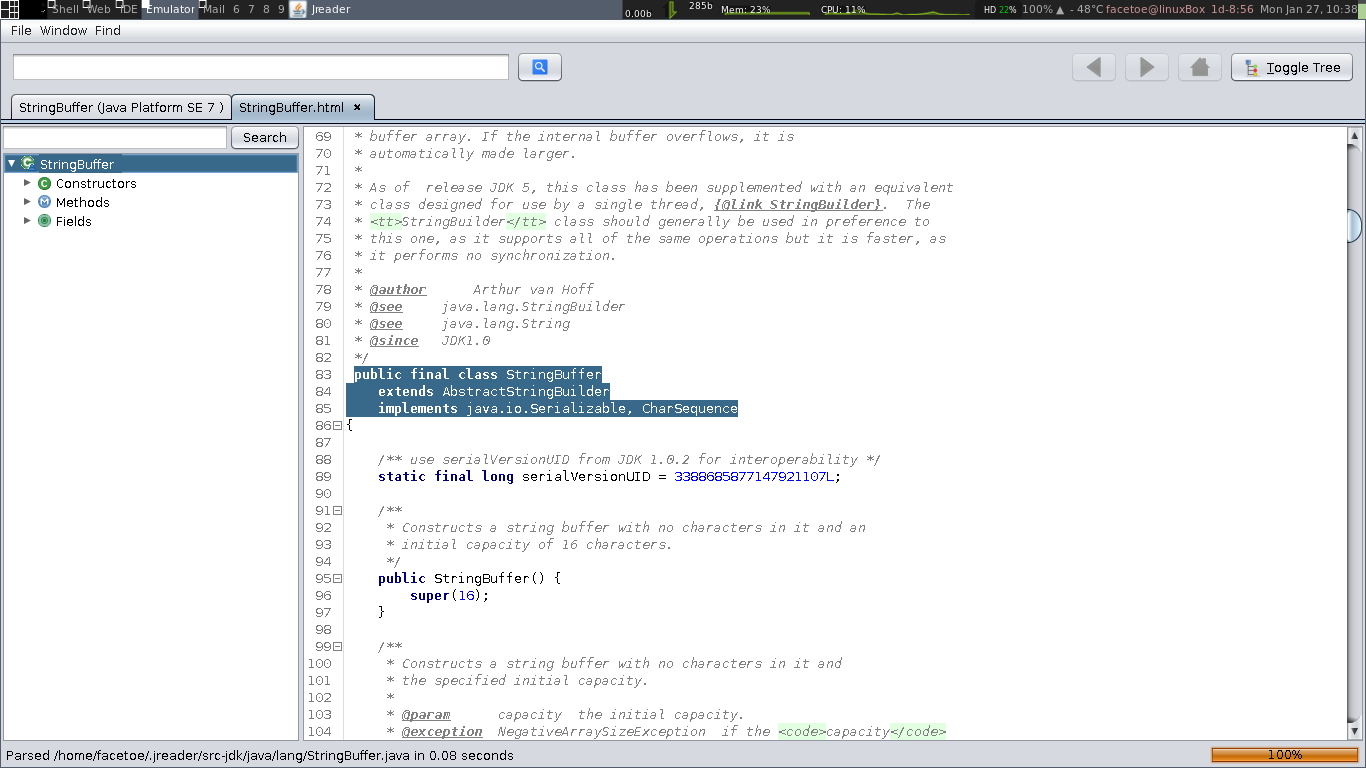Here we have the documentation for StringBuffer. Note that JReader auto-completed the class name. All text boxes in JReader support auto-completion.