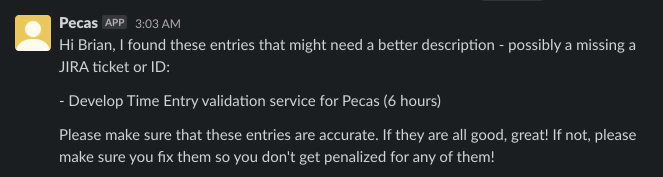 Once a day, we should have a scheduled job that reviews all the entries submitted by the team during that day. The task should probably run every weekday at 8pm in the user's local time zone as defined by Slack.