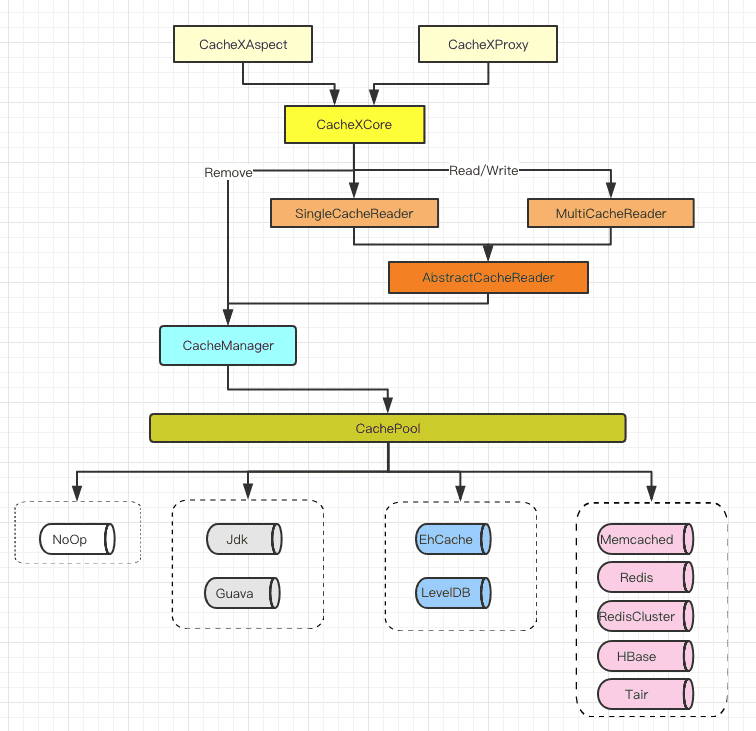 指定缓存实现: CacheXAspect /CacheXProxy 的caches 参数的key |