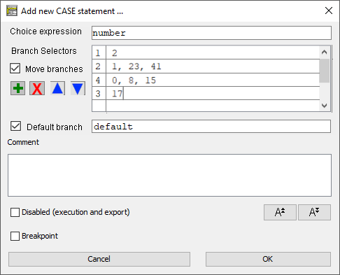 The new editor could address this via a controlled line manipulation in the branch selector table (via the coloured-icon buttons). The first column would keep track of the original line numbers and if the check box "Move branches" is selected (should be disabled for a new CASE element, of course) on committing then the existing branches would be rearranged according to the new line number permutation. Inserted new lines would not get such line numbers - the respective field remains empty. The first column wouldn't be editable therefore, just the second table column.