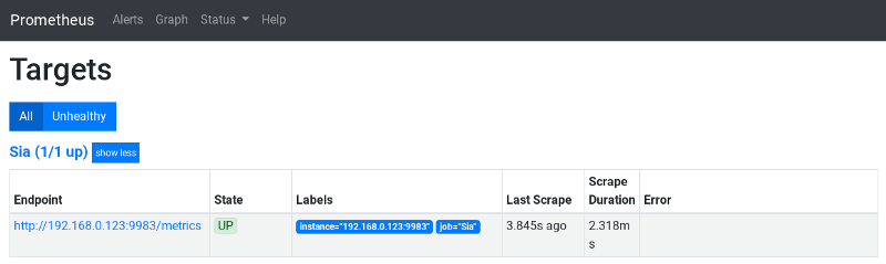Now log in to the Prometheus and verify its successfully scraping the sia_exporter metrics.