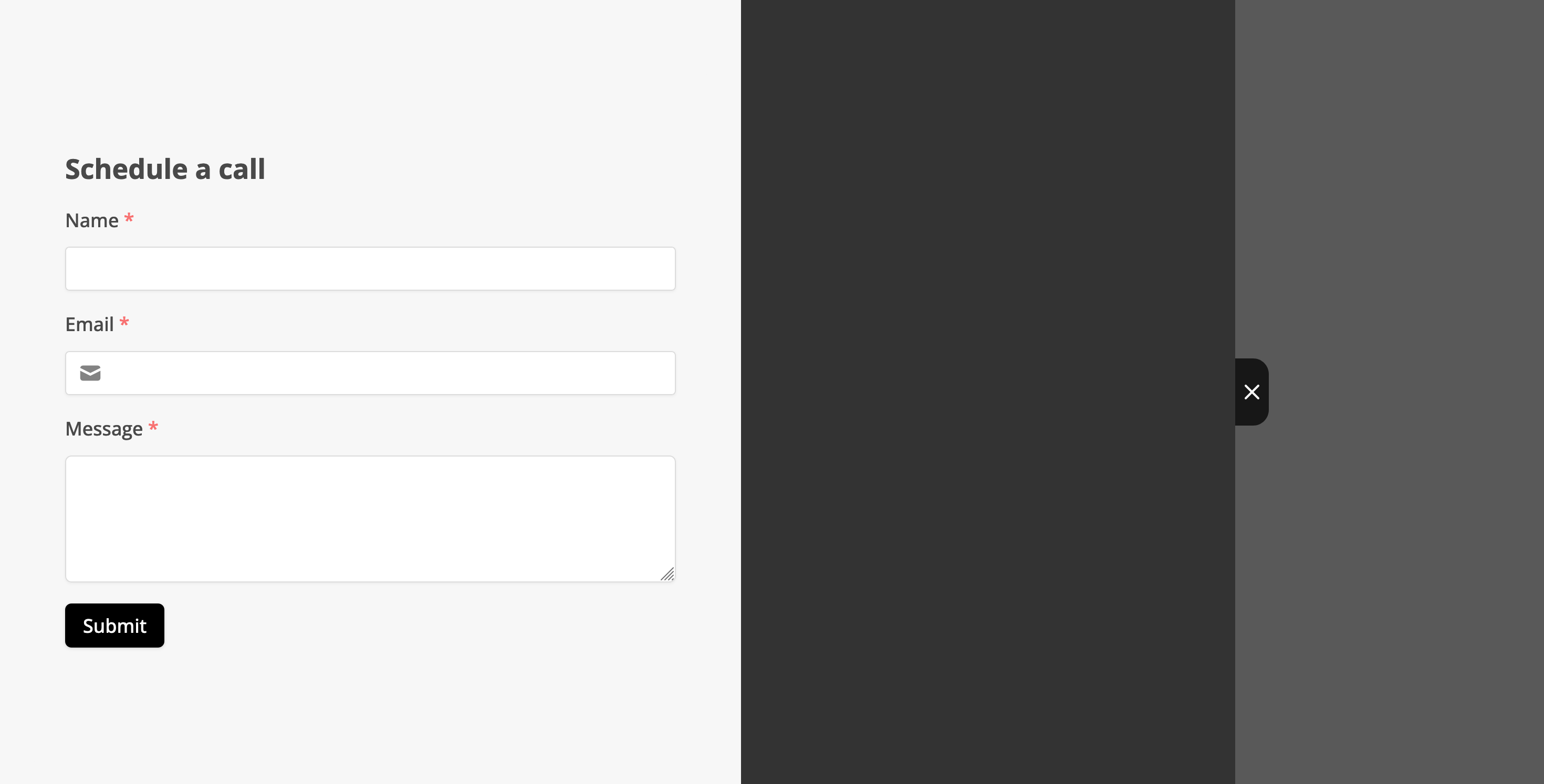 export default App;Similar to the popup embed, this is intended to be used alongside your own button and state, so the component requires isOpen and onClose props. The form will slide out from the side of the screen. You can control which direction it comes from using sliderDirection, which can be left or right (default).