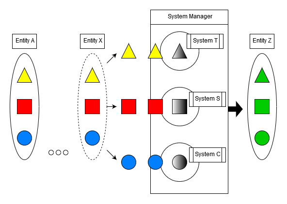 Entities (the correspondent of Objects) now held attributes called Components (essentially data units), that are evaluated independently in such a matter that these structures are seemingly dependency-free. The new game logic is driven by Systems, each taking a specific type of Component and editing the data in these units. Adding new functionalities now consists of adding a new System with an independent logic and a matching component (though this is not mandatory). Also see the Appendix .