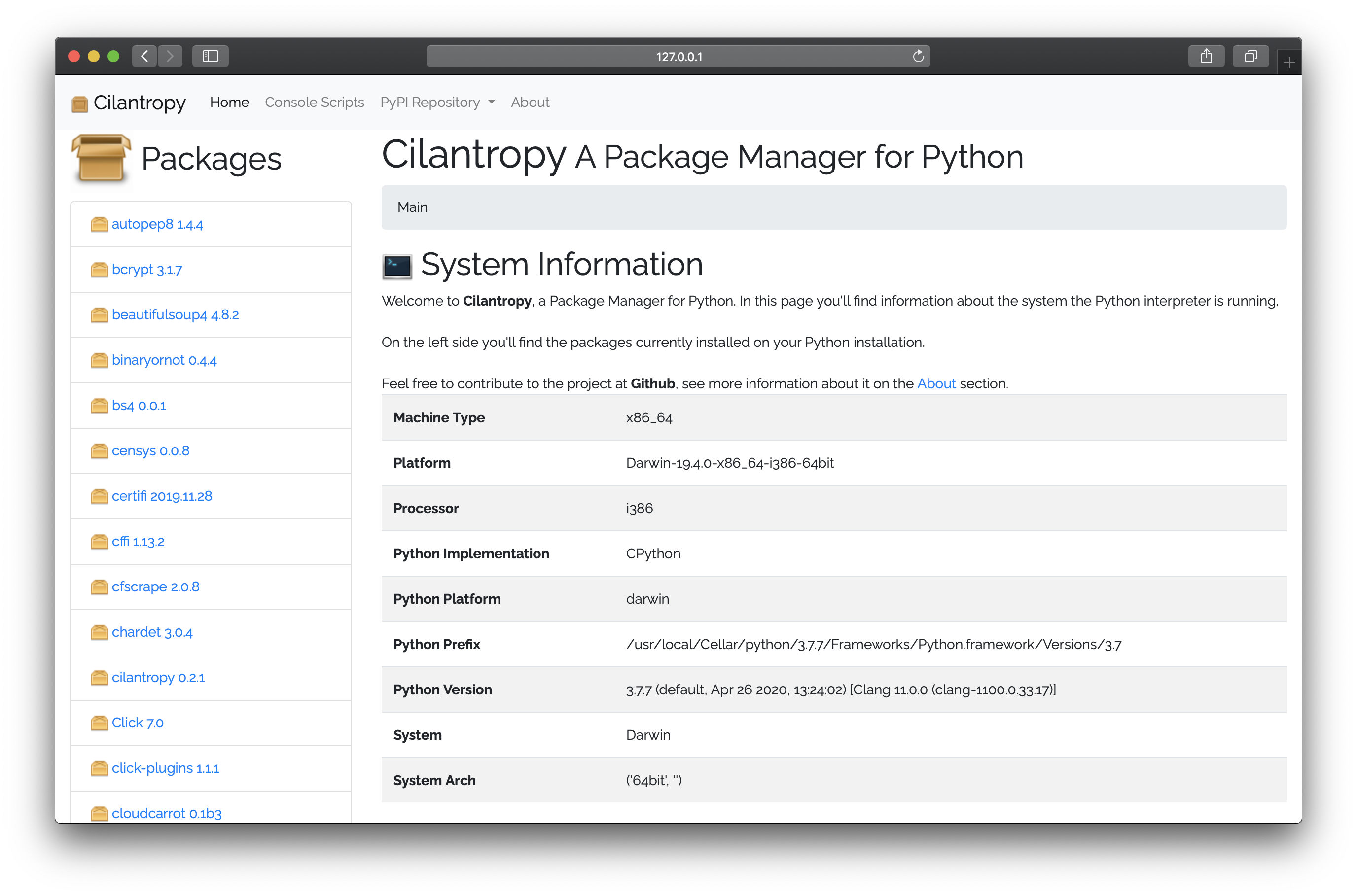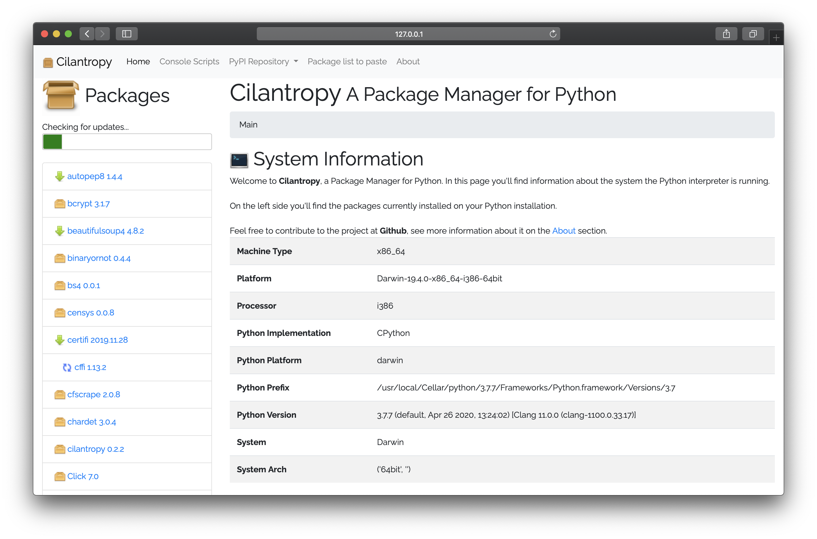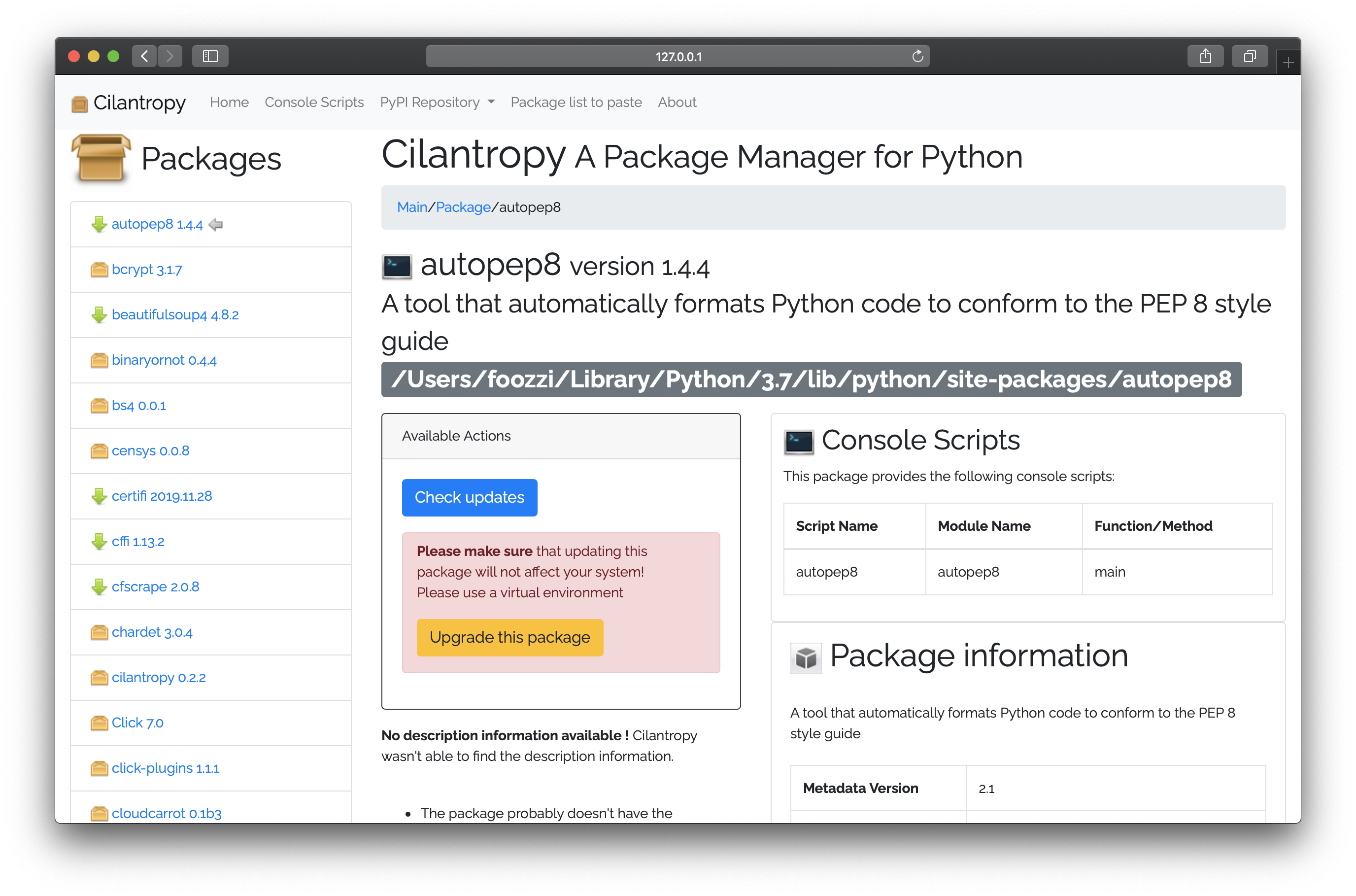 Cilantropy is a Python Package Manager interface created to provide an "easy-to-use" visual and also a command-line interface for Pythonistas. Today we have many nice distribution utilities like pip, distribute, etc, but we don't have a nice visual approach to inspect current installed packages, show projects metadata, check for PyPI updates, etc.
