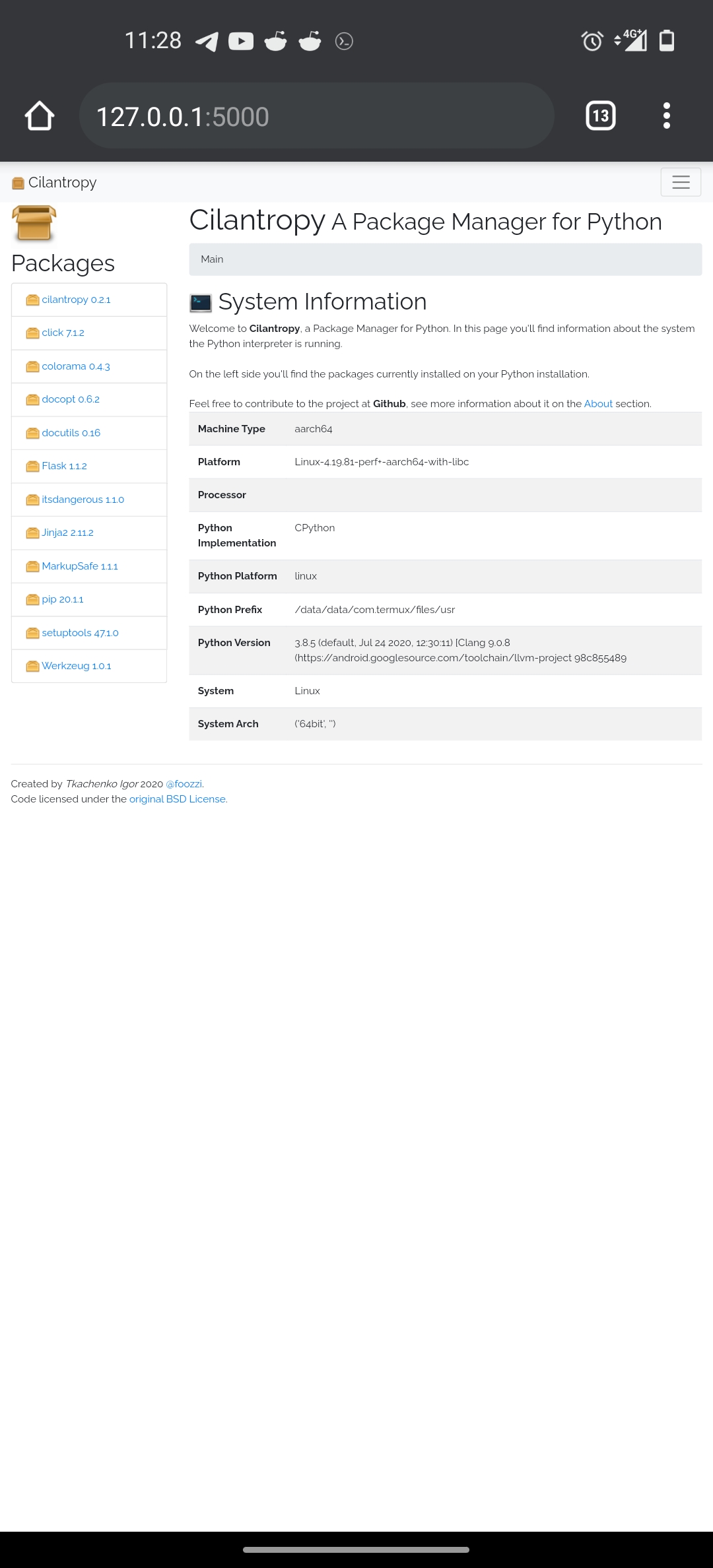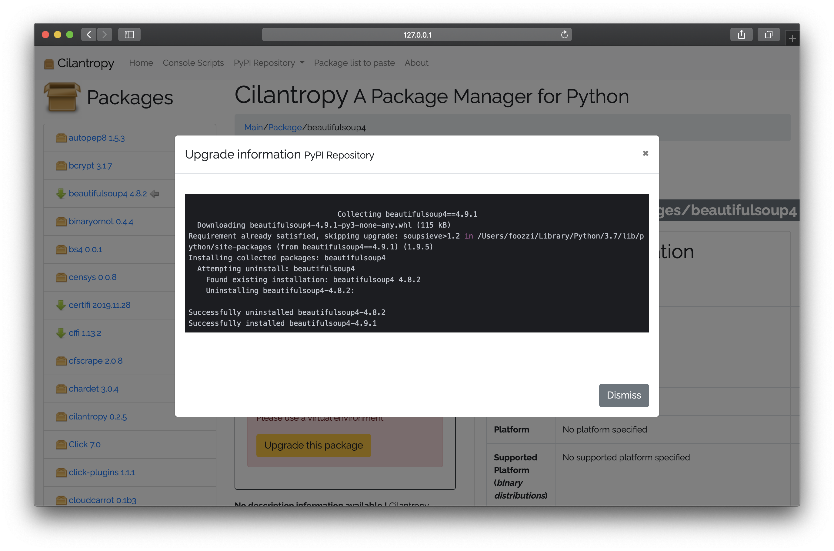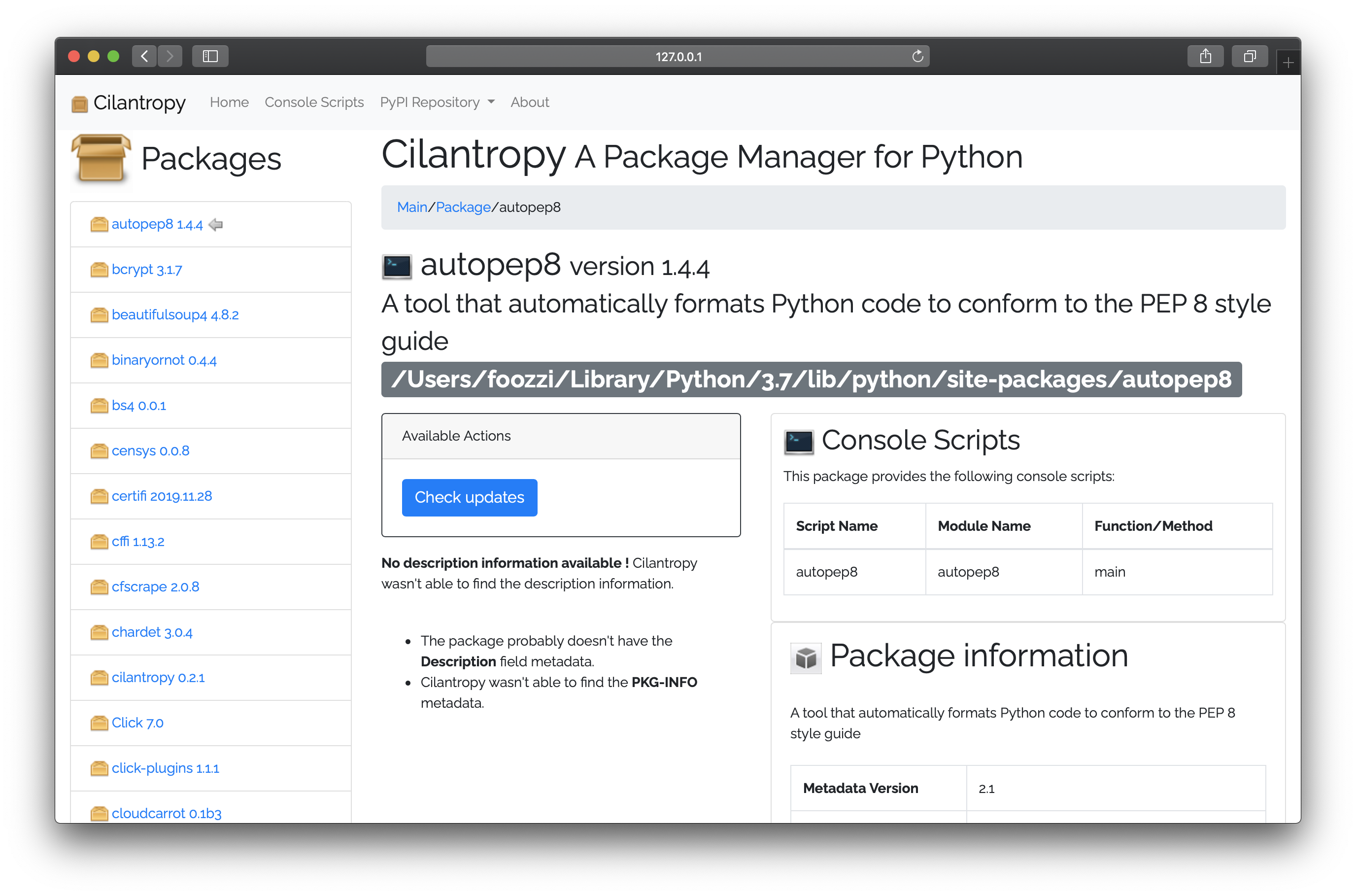 Cilantropy is a Python Package Manager interface created to provide an "easy-to-use" visual and also a command-line interface for Pythonistas. Today we have many nice distribution utilities like pip, distribute, etc, but we don't have a nice visual approach to inspect current installed packages, show projects metadata, check for PyPI updates, etc.