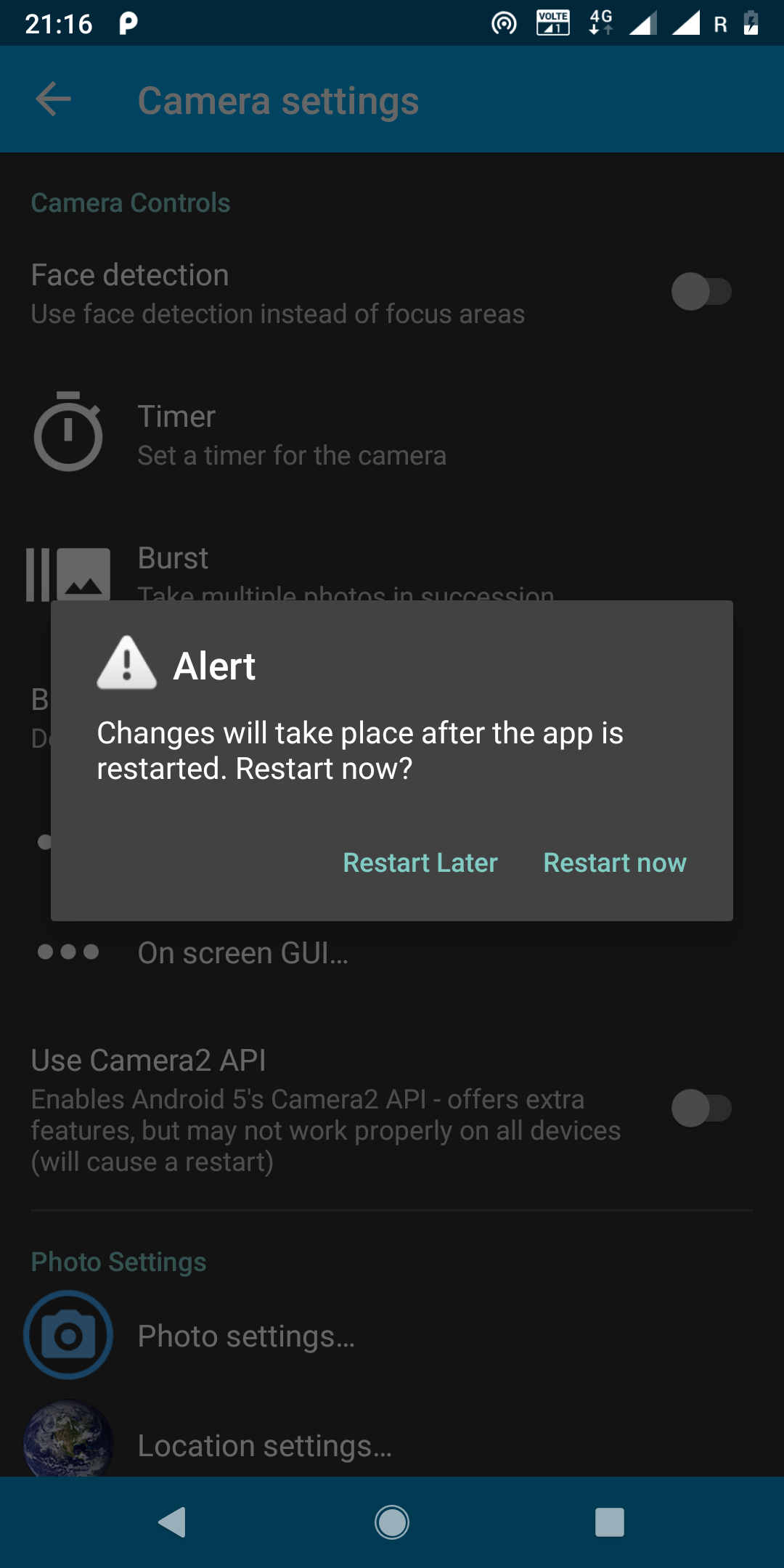 Changes: The user is given the choice of restarting the app immediately or later. If the user does not want to restart the app immediately, the changes are made when the app is closed and restarted by the user whenever the user closes the app and restarts it manually.