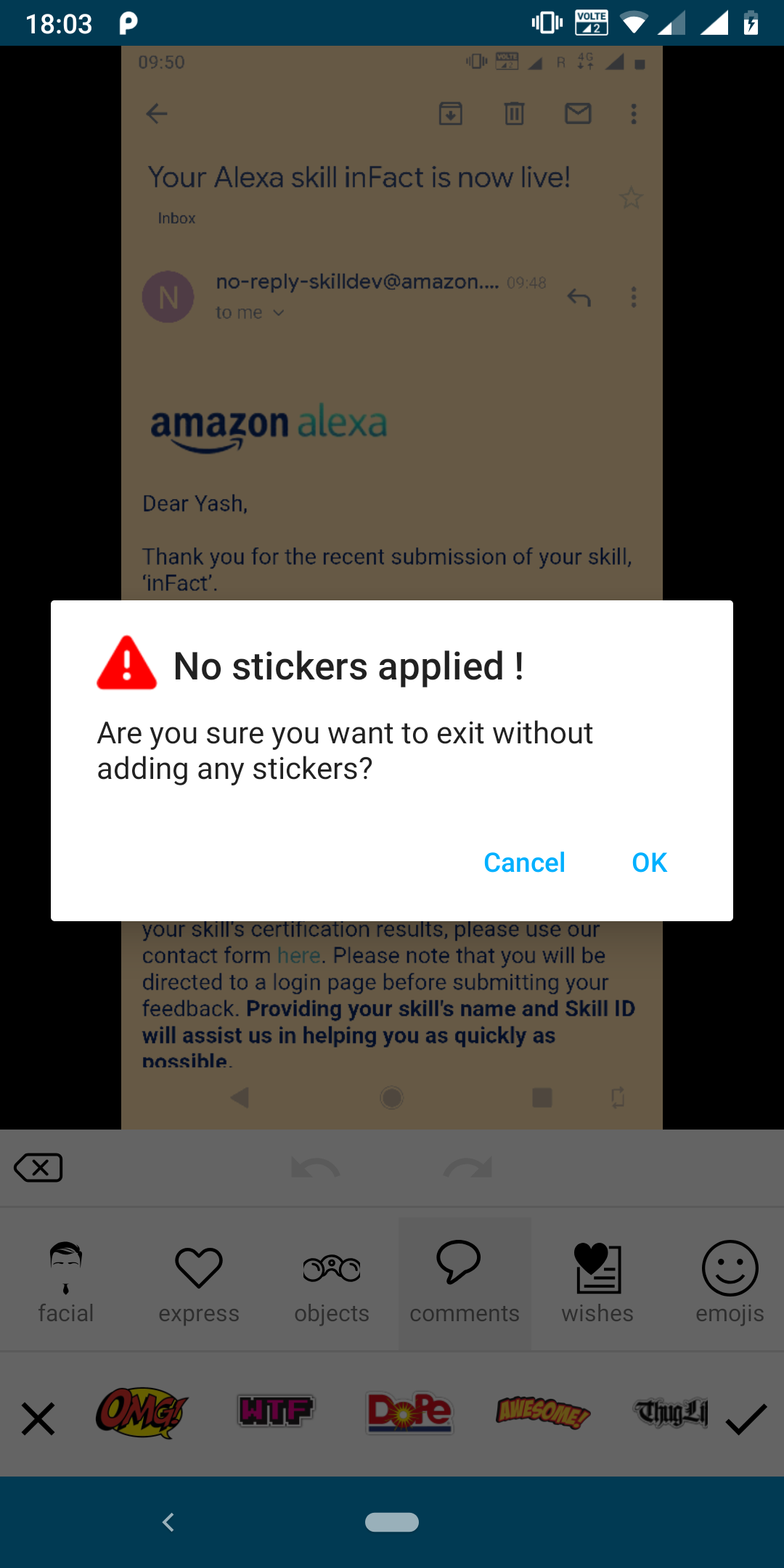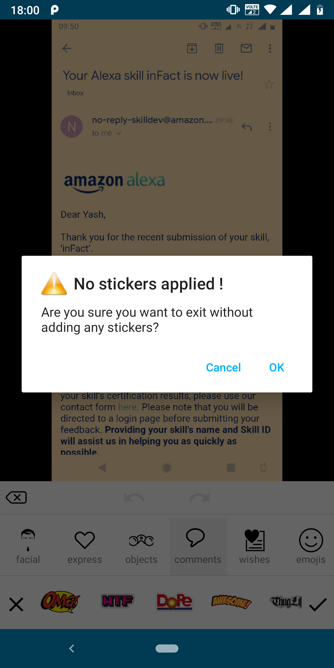 Changes: If user presses tick button in stickers section without using any sticker, an alert is shown.