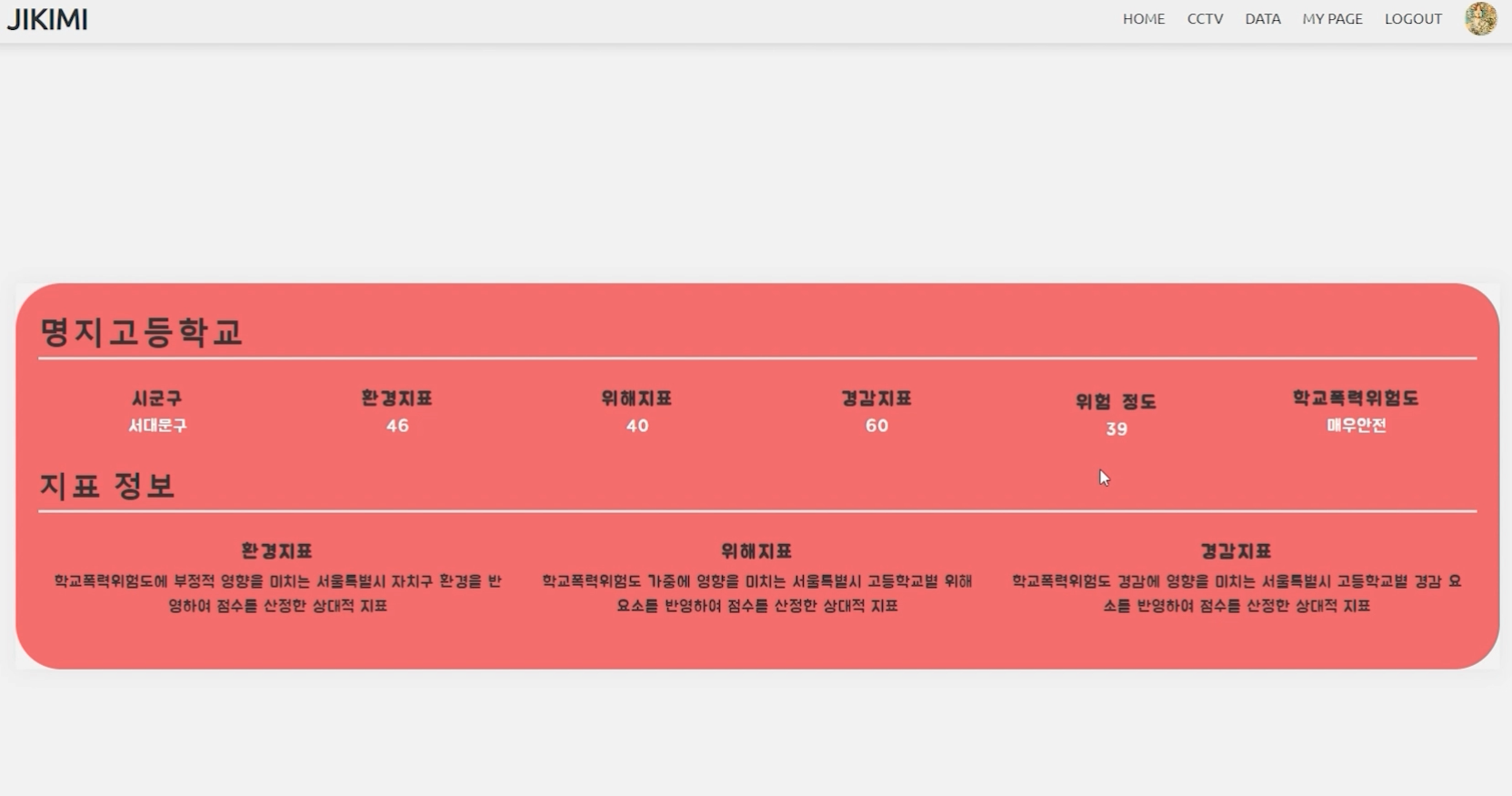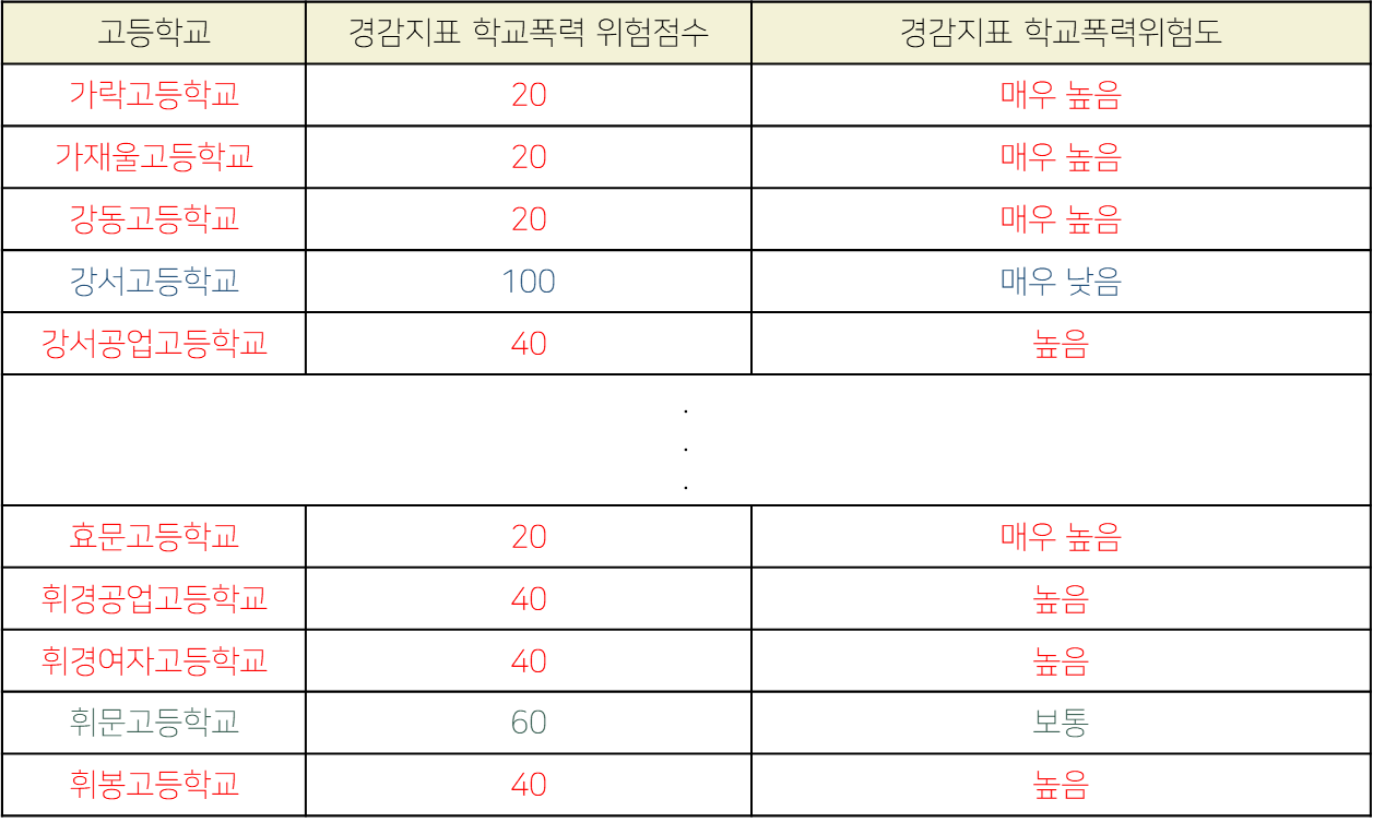 학교폭력위험점수란, 환경지표 · 위해지표 · 경감지표에서 학교폭력위험에 영향을 미치는 상관계수 크기를 가중치로 부여해서 계산한 학교폭력종합점수이다. 점수는 0 ~ 100의 범위를 가지며, 점수와 위험도는 비례한다.