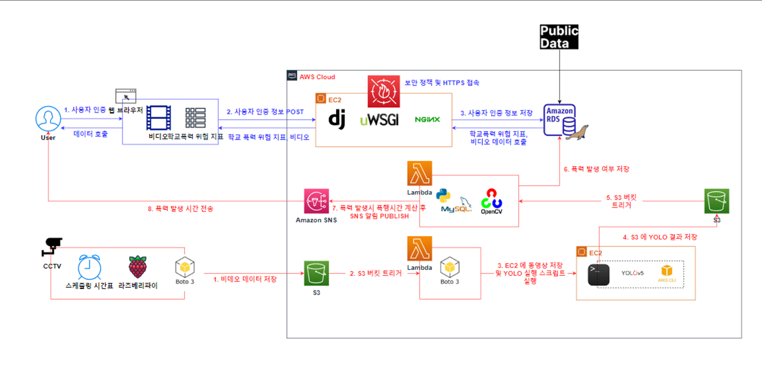 - 학교에 설치된 CCTV에서 폭력 감지 시 학교선생님께 SMS 전송