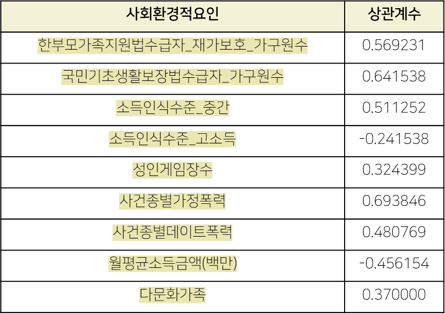 사회환경요인과 실제학교폭력신고수·피해응답학생 수 상관분석 진행