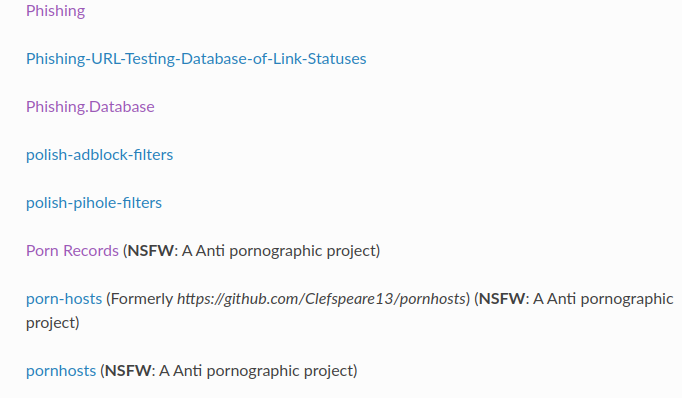 1. Added link to https://github.com/mitchellkrogza/Phishing 2. Updated link for _pornhosts (GH protection) 3. Added new link for _porn-hosts as it old one was missing. GH took down the original path, so moved the source to mypdns and attentent the proper link as all releases are runned through @PyFunceble 4. Added NSFW comments for links to mainly Anti Adult lists (GH protection)