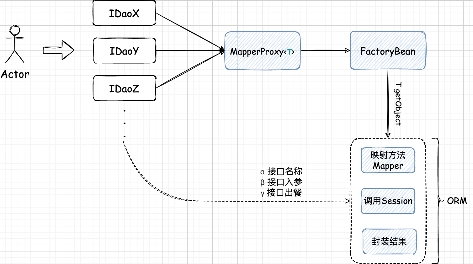 从小傅哥最开始对 Mybatis 感兴趣,主要来自于好奇:**“为什么在使用 Mybatis 的时候,只需定义一个接口,不用写实现类就能使用 XML 中或者注解上配置好的 SQL 语句,就能完成对数据库 CRUD 的操作呢?” ** 原来这里最核心的是用到了接口代理类,把每一个数据库操作的 DAO 接口都用操作数据库的代理类实现,并注册到 Spring 容器让用户去使用。