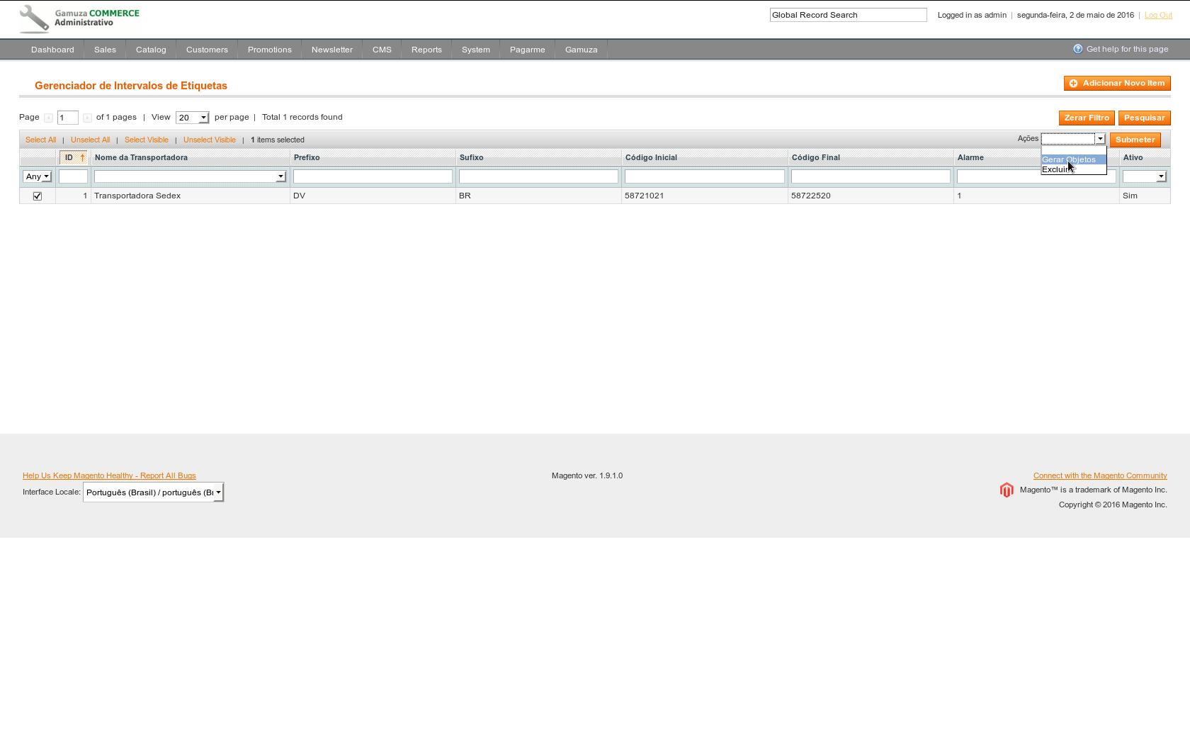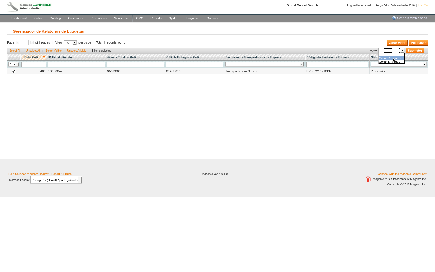 Acesse: Gamuza -> Gerenciar Relatórios de Etiquetas, marque um pedido e escolha a opção Gerar Entregas (as entregas dos pedidos serão criadas com os códigos de rastreio já inseridos).