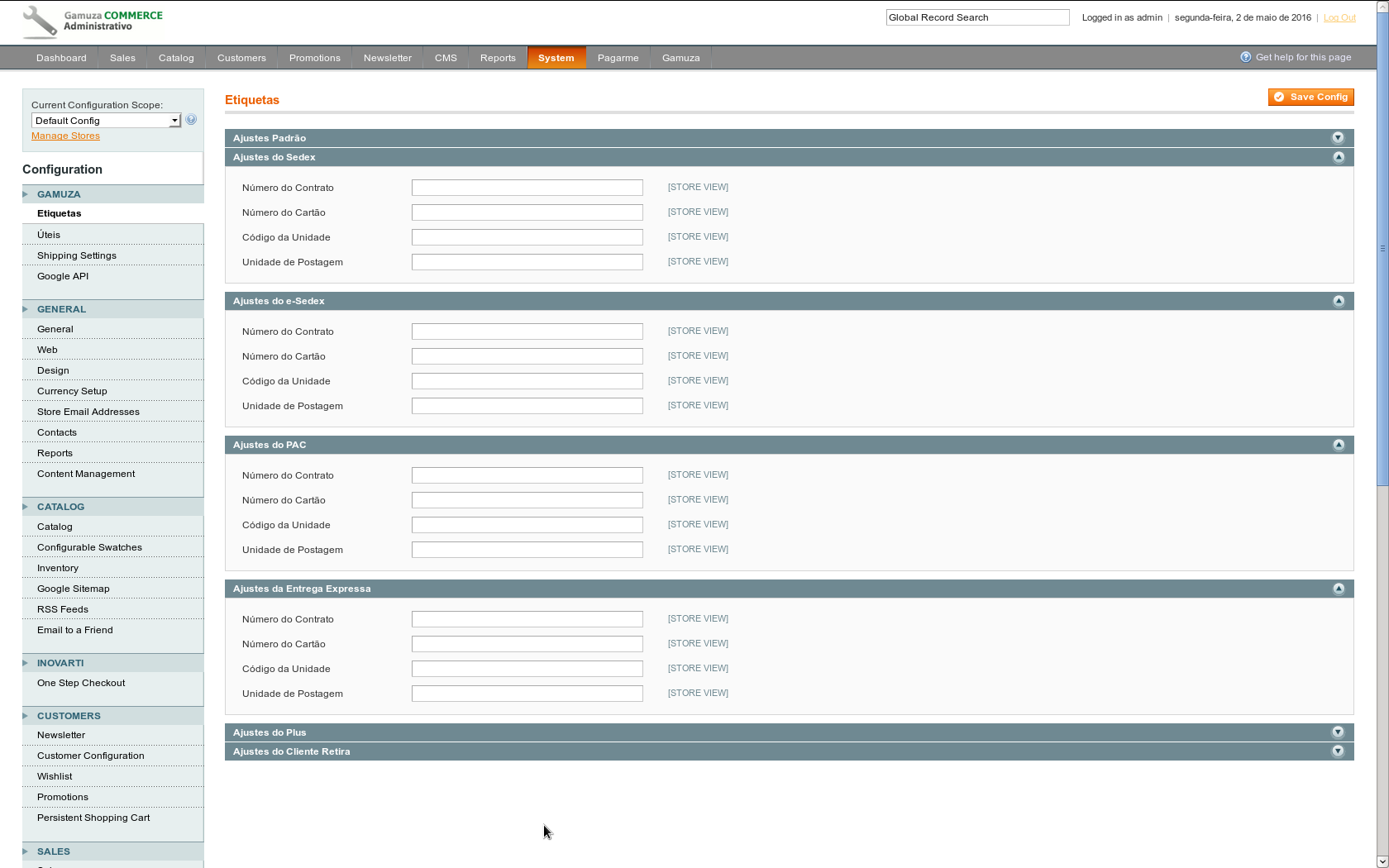 Nesse painel você configura os ranges que foram obtidos através dos Correios.