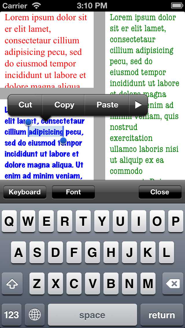 KWTextEditor provides a toolbar which has [Keyboard], [Font] and [Close] buttons upon KWFontPicker or iOS's software keybaord.