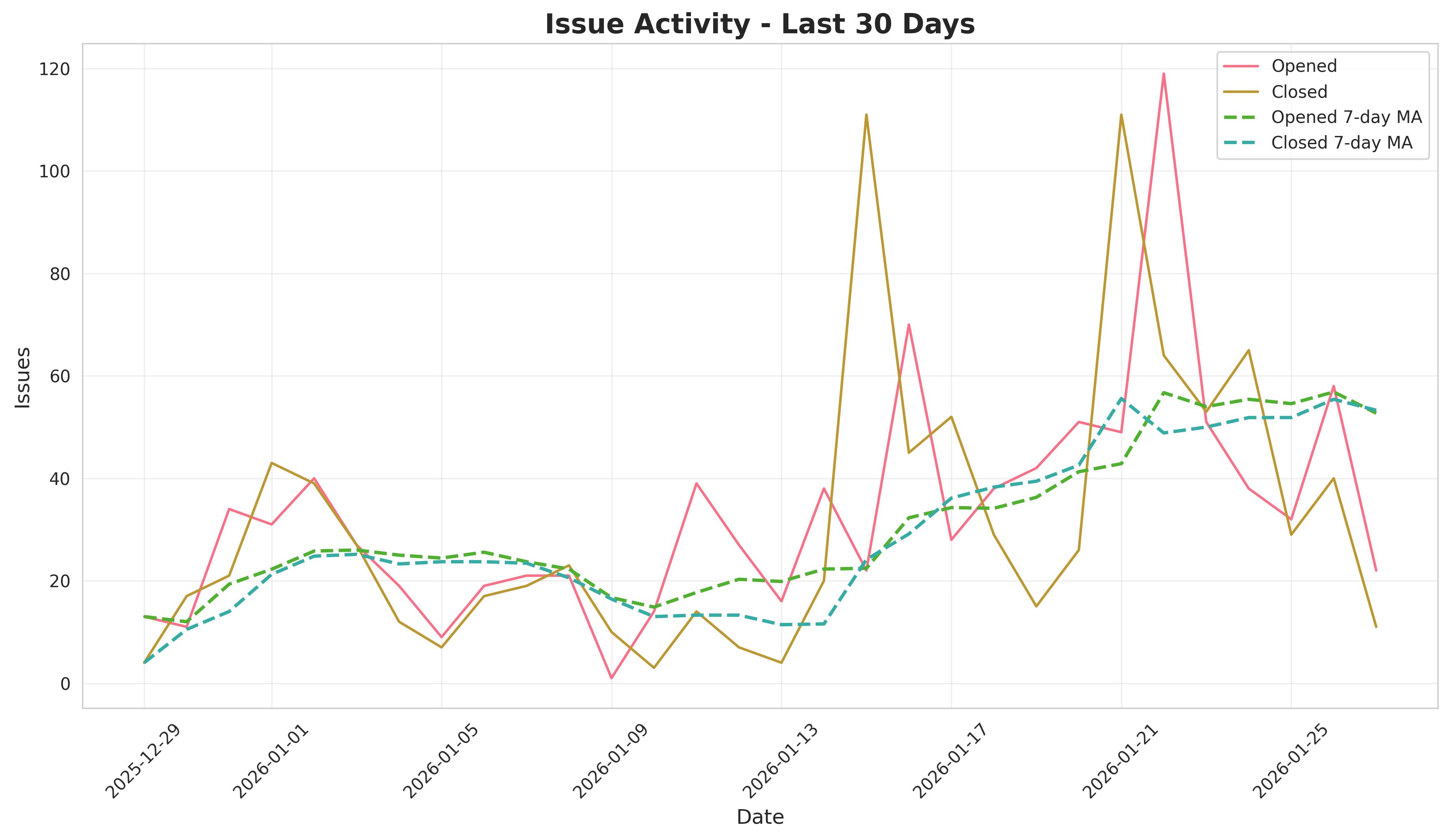 Two key signals stand out today: issue volume remains extremely high (1,000 issues opened in the last 30 days, 382 in the last 7), and the open backlog is still lean at 62 issues (6.2%). Average time to close is under a day, which suggests throughput is keeping pace with intake.