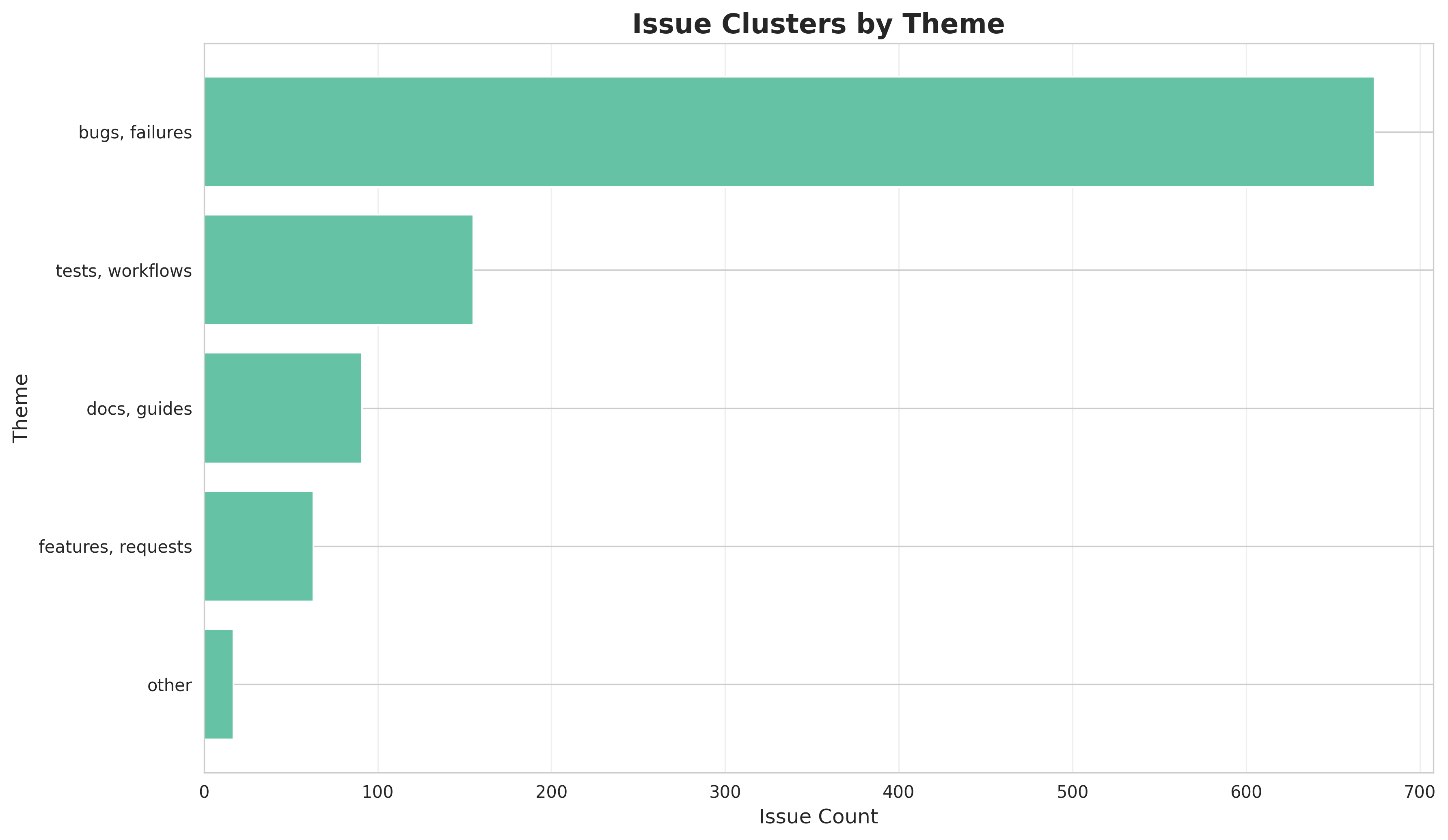 Bug/failure reports dominate the landscape, followed by a sizable cluster around tests and workflows. Documentation and feature requests appear in smaller but notable volumes.