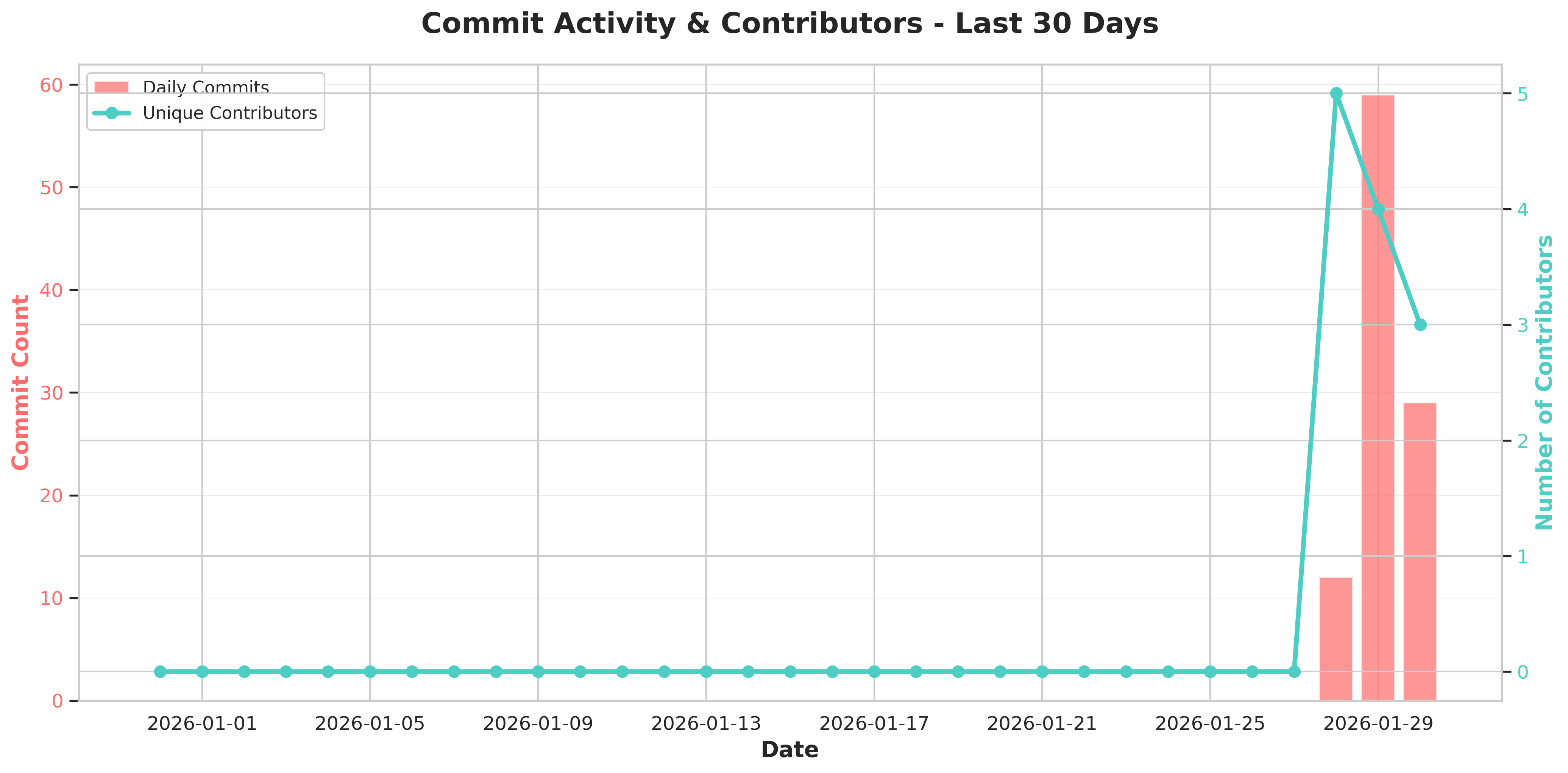 The commit landscape tells a story of sustained engagement punctuated by explosive productivity spikes. Daily commits fluctuate between 0 and 15, with today's 20-commit surge representing a significant peak. The contributor count (3-5 unique developers per active day) suggests a tight-knit team where individual productivity amplified by AI assistance creates outsized impact. Notice how contributor diversity peaks correlate with high commit volumes—a sign that collaborative momentum breeds innovation.