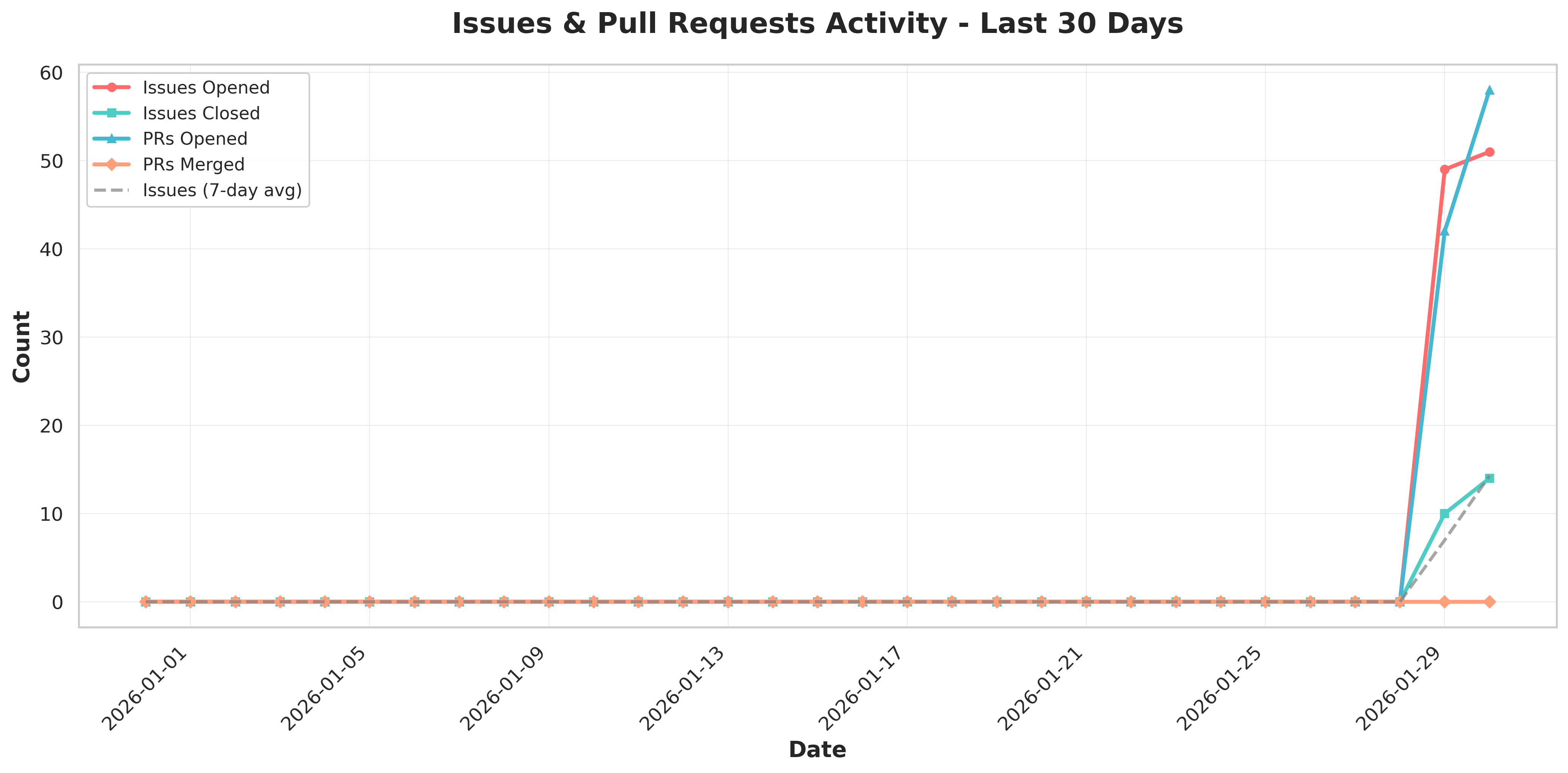The 30-day trend reveals a fascinating pattern: issue creation maintains a steady drumbeat averaging 3-4 per day, while pull request activity shows distinct peaks of productivity. The most striking feature is the consistent closure rate—issues that open rarely linger, suggesting a team that prioritizes rapid resolution. The 7-day moving average smooths out weekend dips, revealing that weekday velocity drives the project forward while weekends see contemplative pauses.