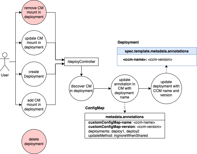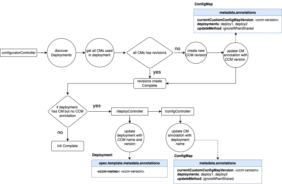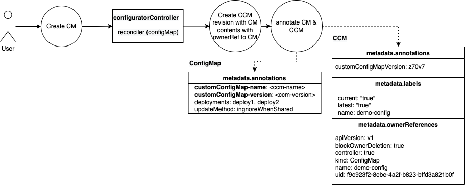 Configurator Controller : Gets triggered during create and update of CM. Creates CCM with CM contents, annotates deployments with CCM version. When a CM is updated, it updates the deployment dependencies - ie., if the CM is used in a deployment, it annotates the CM with deployment dependencies.