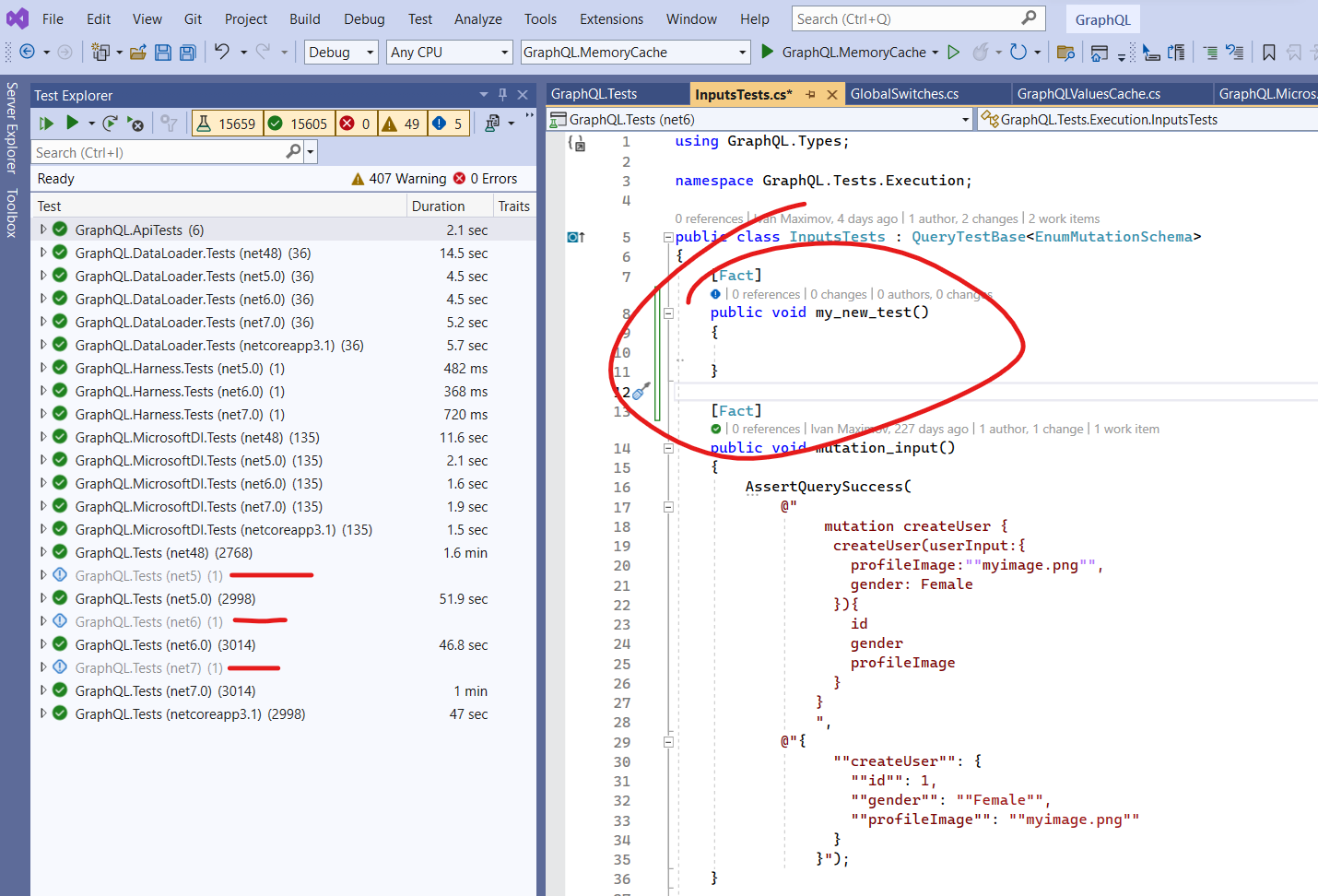 With the targetframework set to net7.0, the new test is added to the proper section in the first place, and so it can be selected and run immediately.