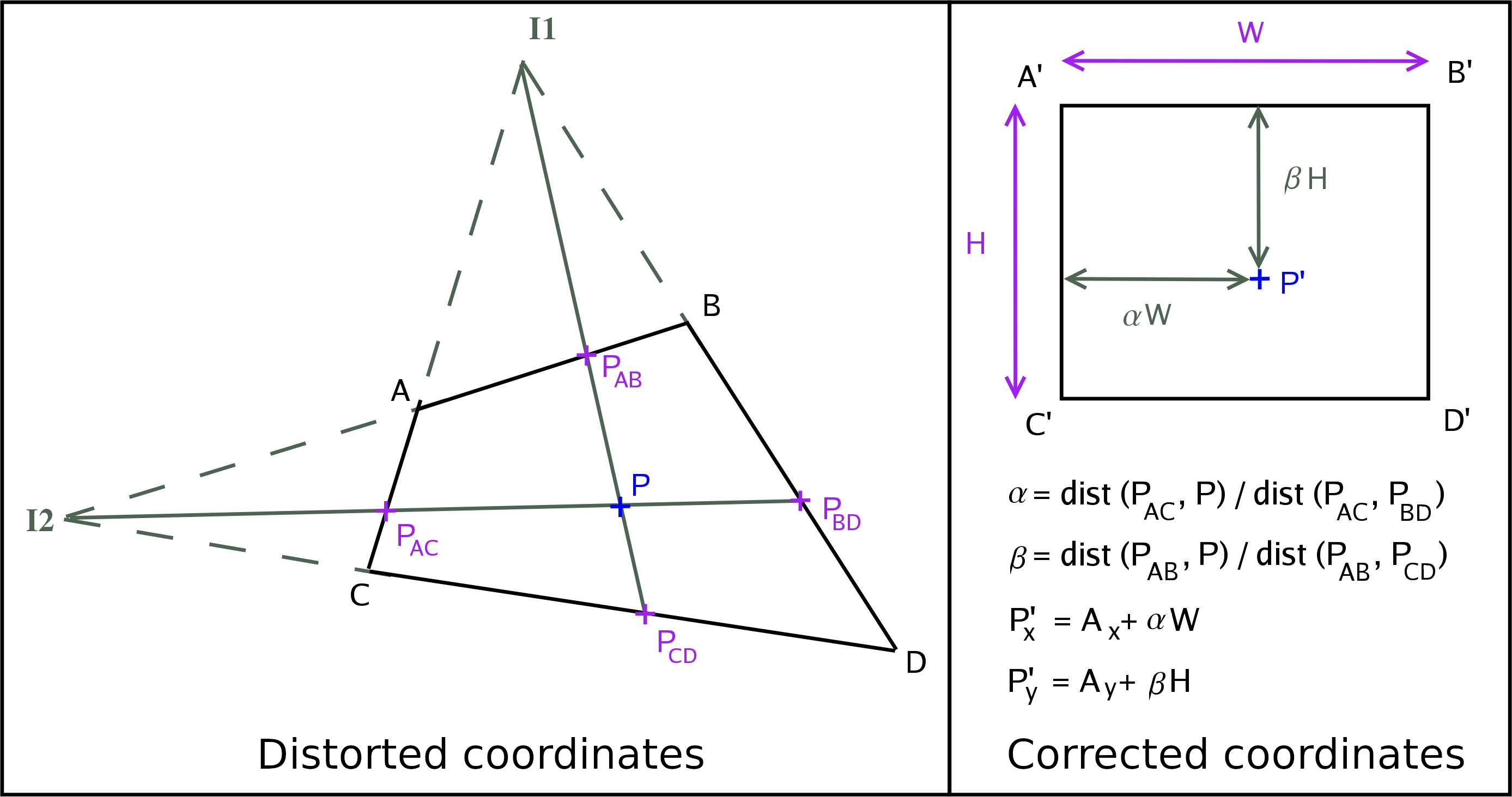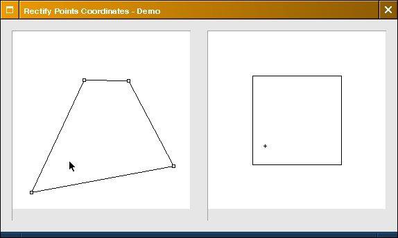 Let P be a 2D point expressed in a plane area defined by four 2D points A,B,C,D. The aim of our C++ class is to express the coordinates of P in order to match when A,B,C,D is rectified as a rectangle. A demo application in GTKmm shows the use of the C++ class.