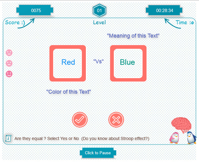 Two words will appear on the screen. User should choose yes if the color of the word in the left matches the meaning of the word in the right or vice versa.
