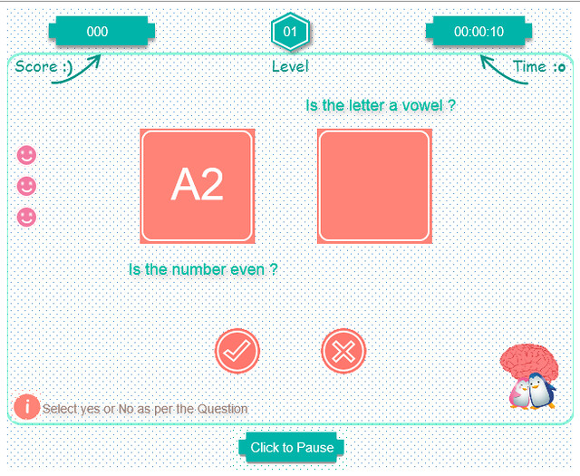 Two boxes will be present. During the play either of the box will get a set consisting of an Integer number and an English alphabet in it and a question will be displayed either below or above the box. The user will be urged to select Yes or No as per the question.